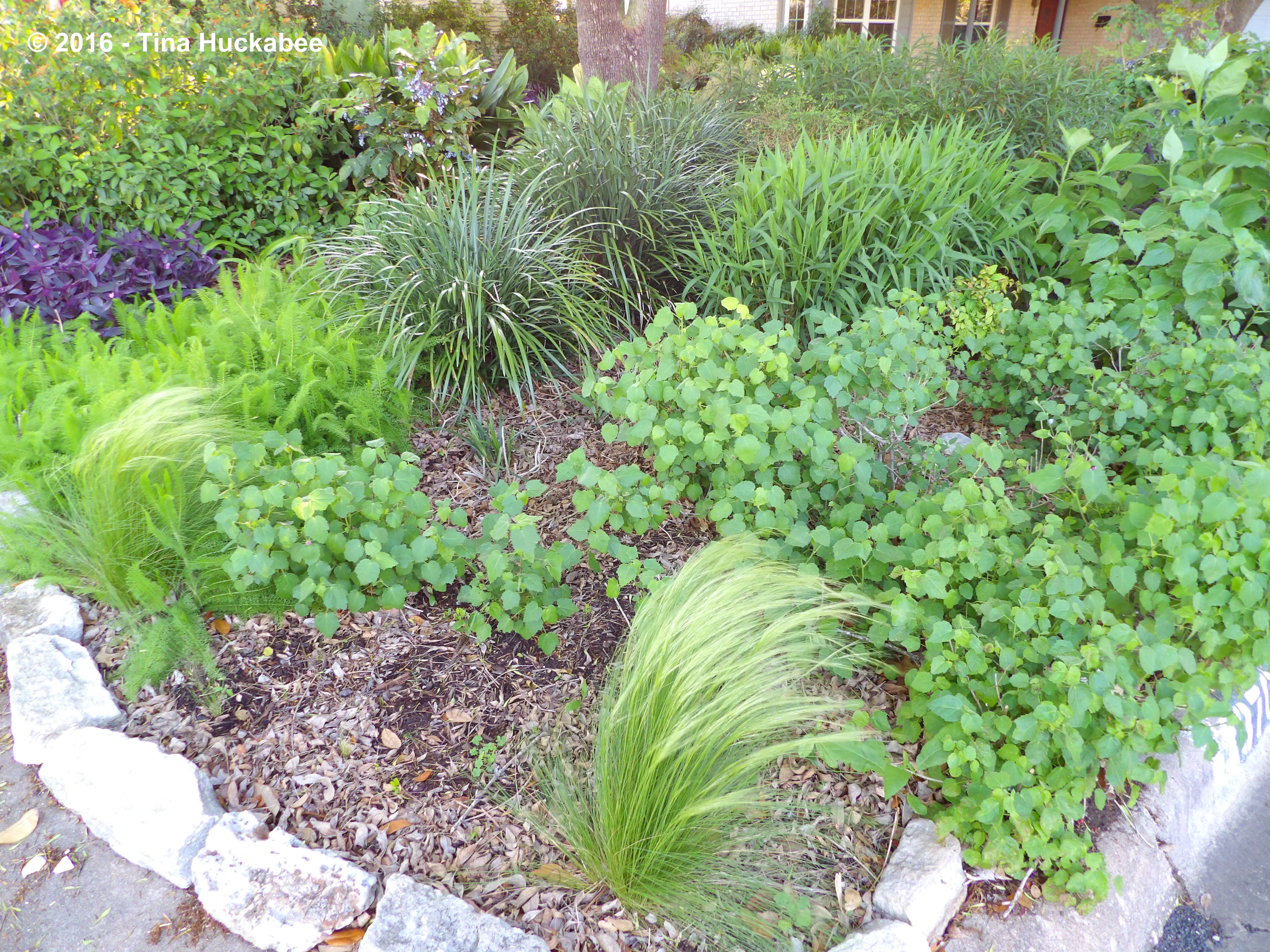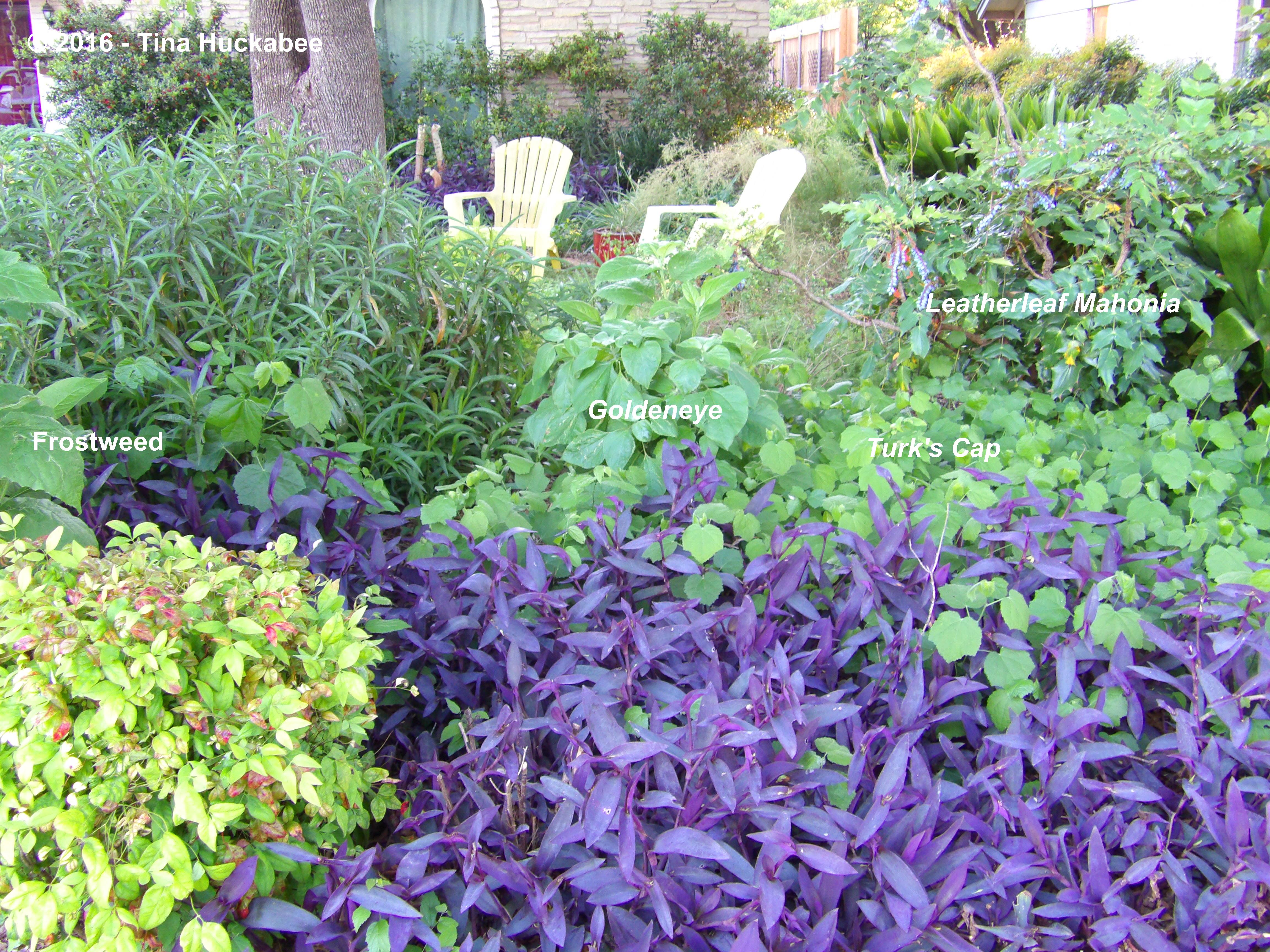 From the street, for now, it’s all about foliage and texture. That will change when the Rock rose, Pavonia lasiopetala, Turk’s cap, Malvaviscus arboreus var. drummondii Frostweed, Verbesina virginica, and Goldeneye, Viguiera dentata, begin their bloom cycles. This corner is challenging: full shade, except for the last, blast of hot, west sun. Additionally, this area fries in the summer with the reflective heat from the street and driveway.