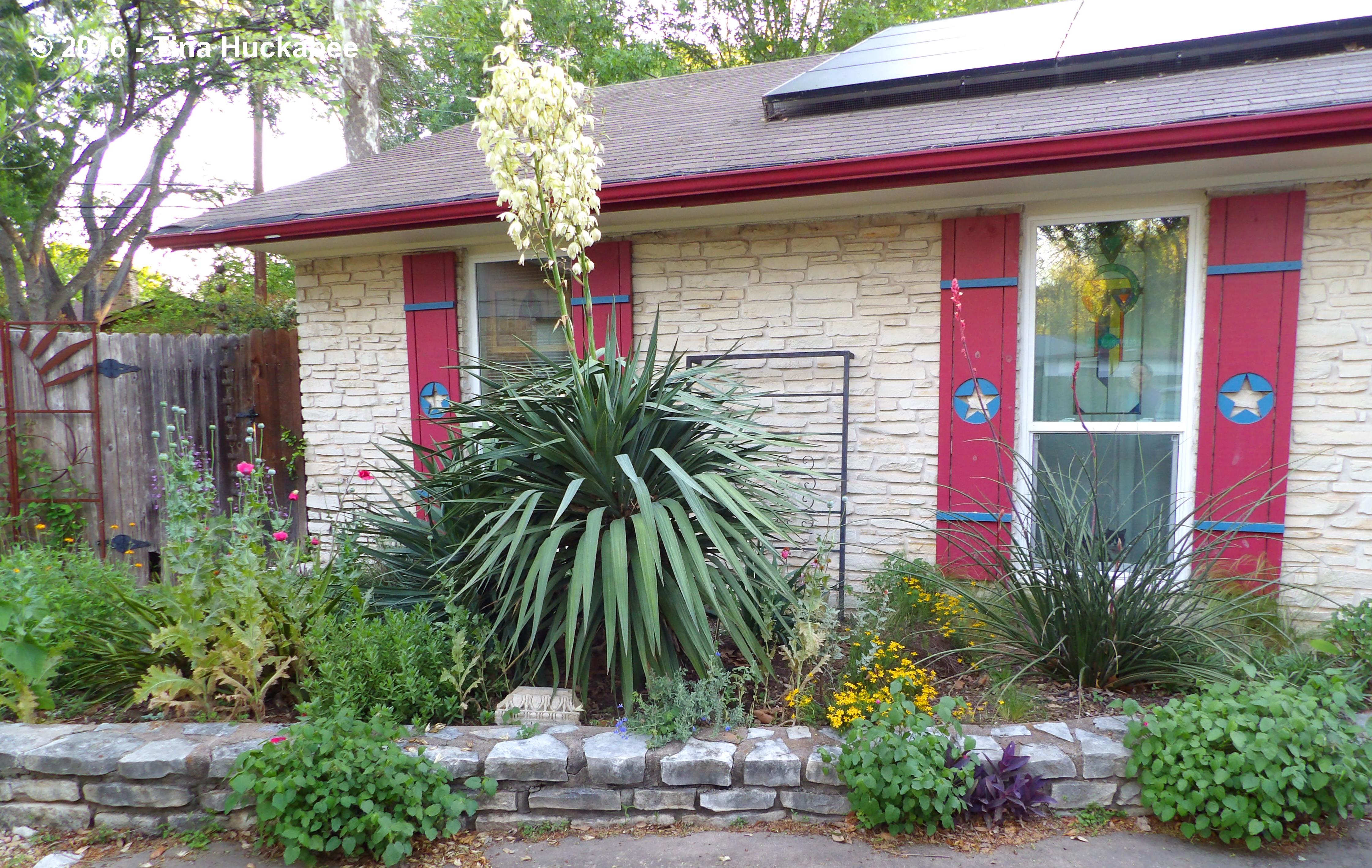 Soft Leaf Yucca is currently in bloom and Red yucca (in front of the window) is now sending forward its bloom stalks. This year there are four. Woo-hoo!!
