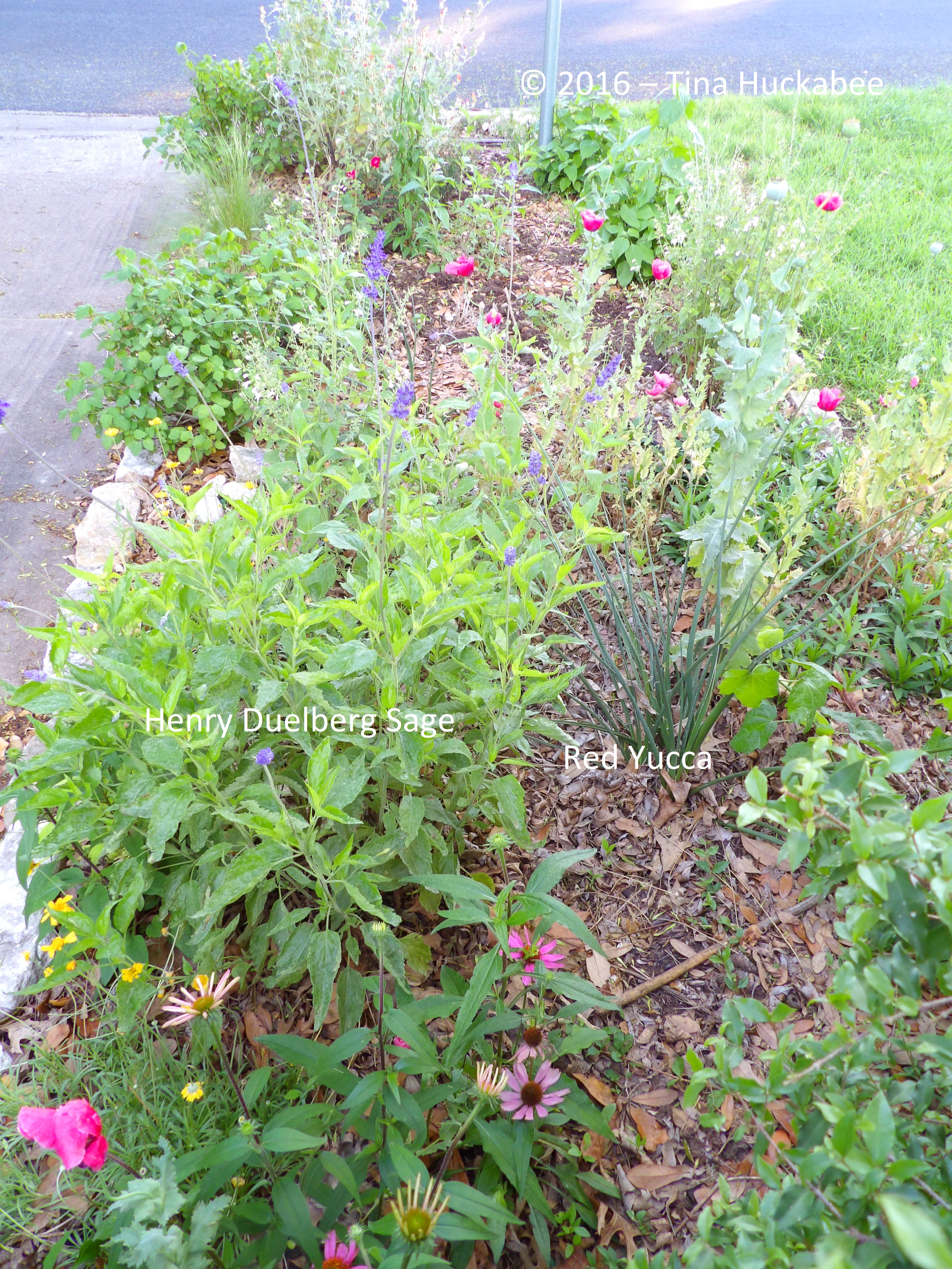 There will be more blooming action during summer and autumn and when the Rock rose, Red yucca, and Martha Gonzales Rose grow to maturity. Some other perennials and shrubs here include Henry Duelberg sage, Salvia farinacea ‘Henry Duelberg’ and Barbados cherry, Malpighia glabra.