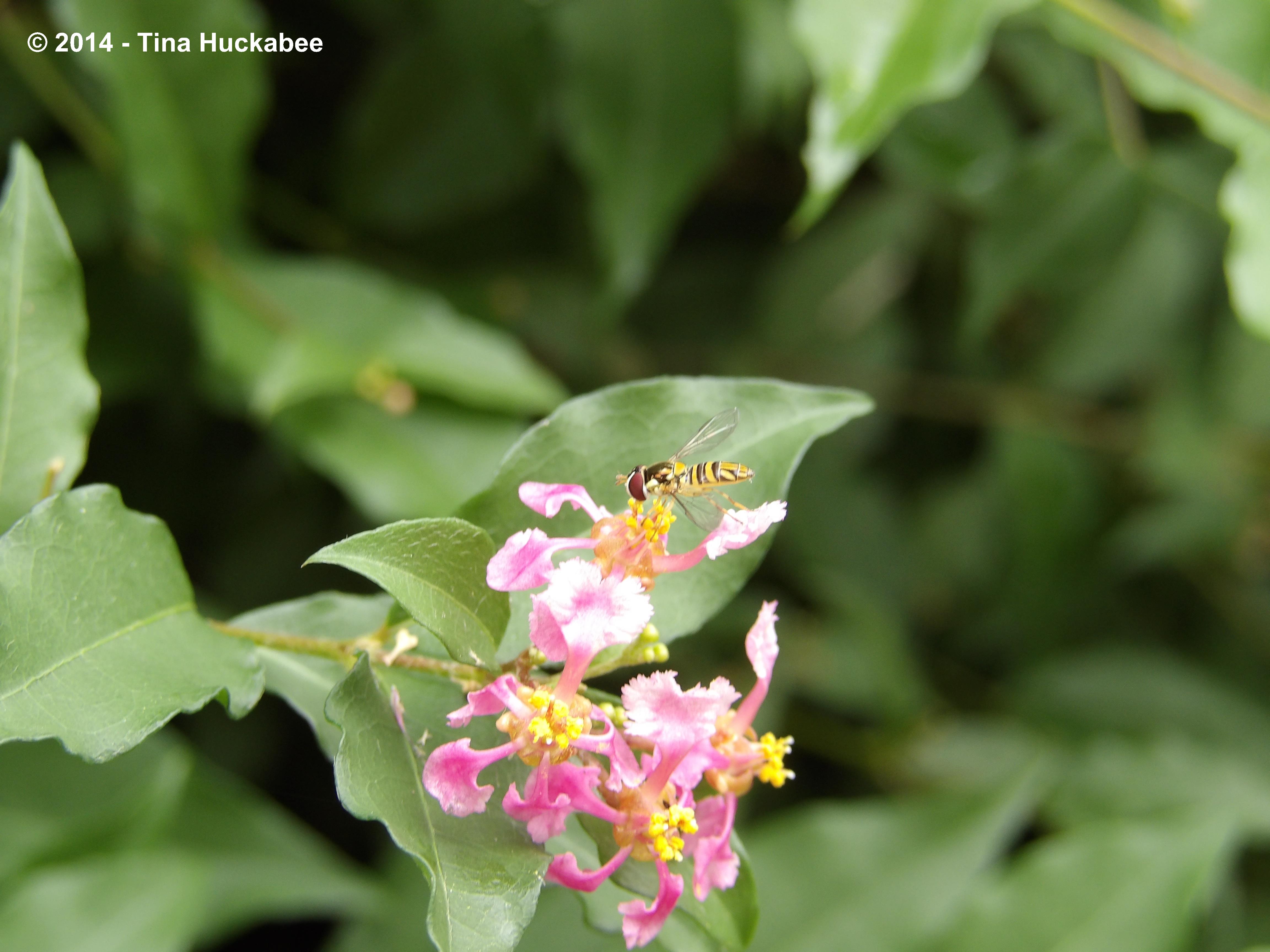 This little “flower fly” is a beneficial garden resident as it sips nectar in its adult stage and controls aphids in its larval stage, as a little green worm. Beautiful to look at and valuable for gardens,