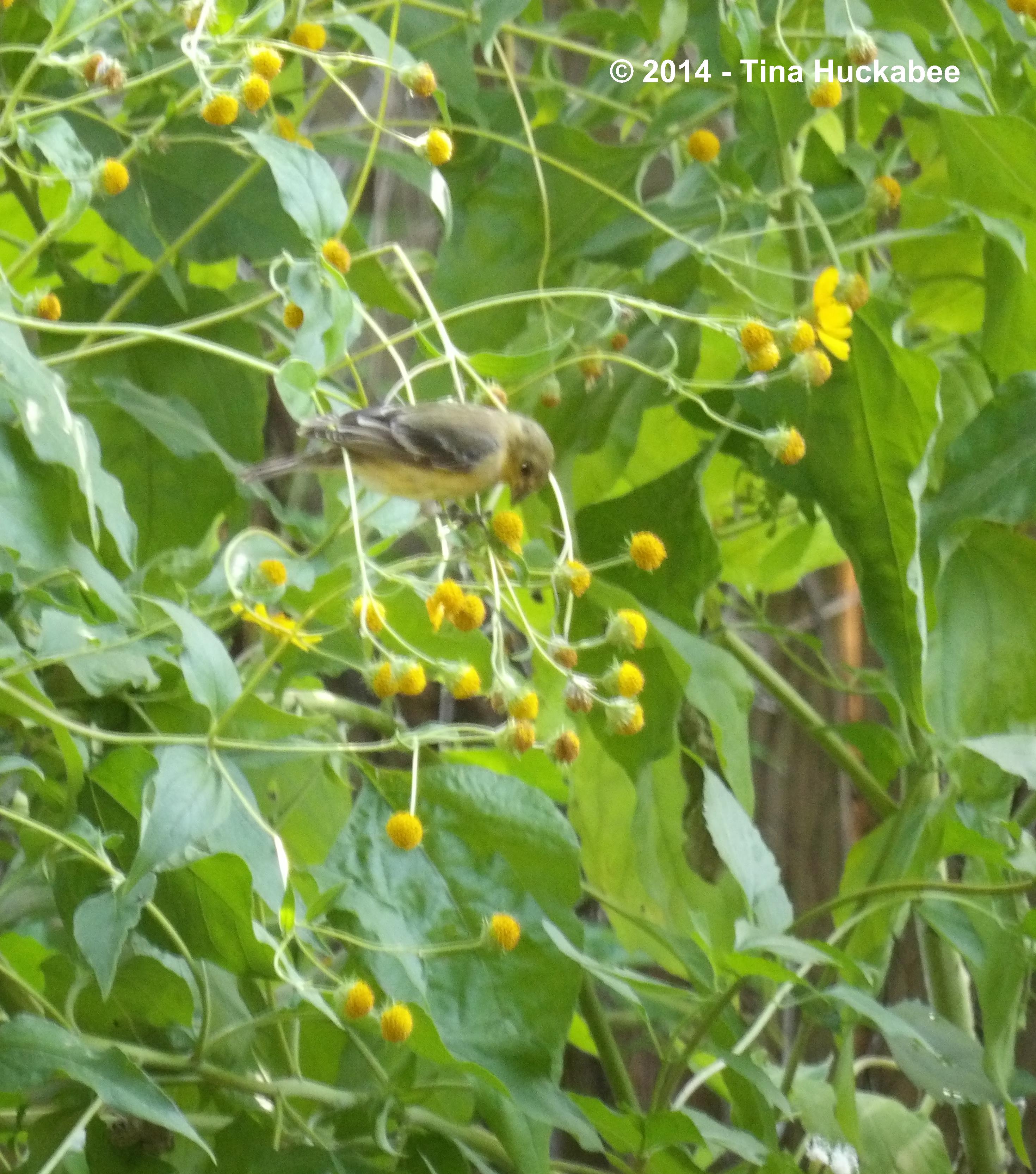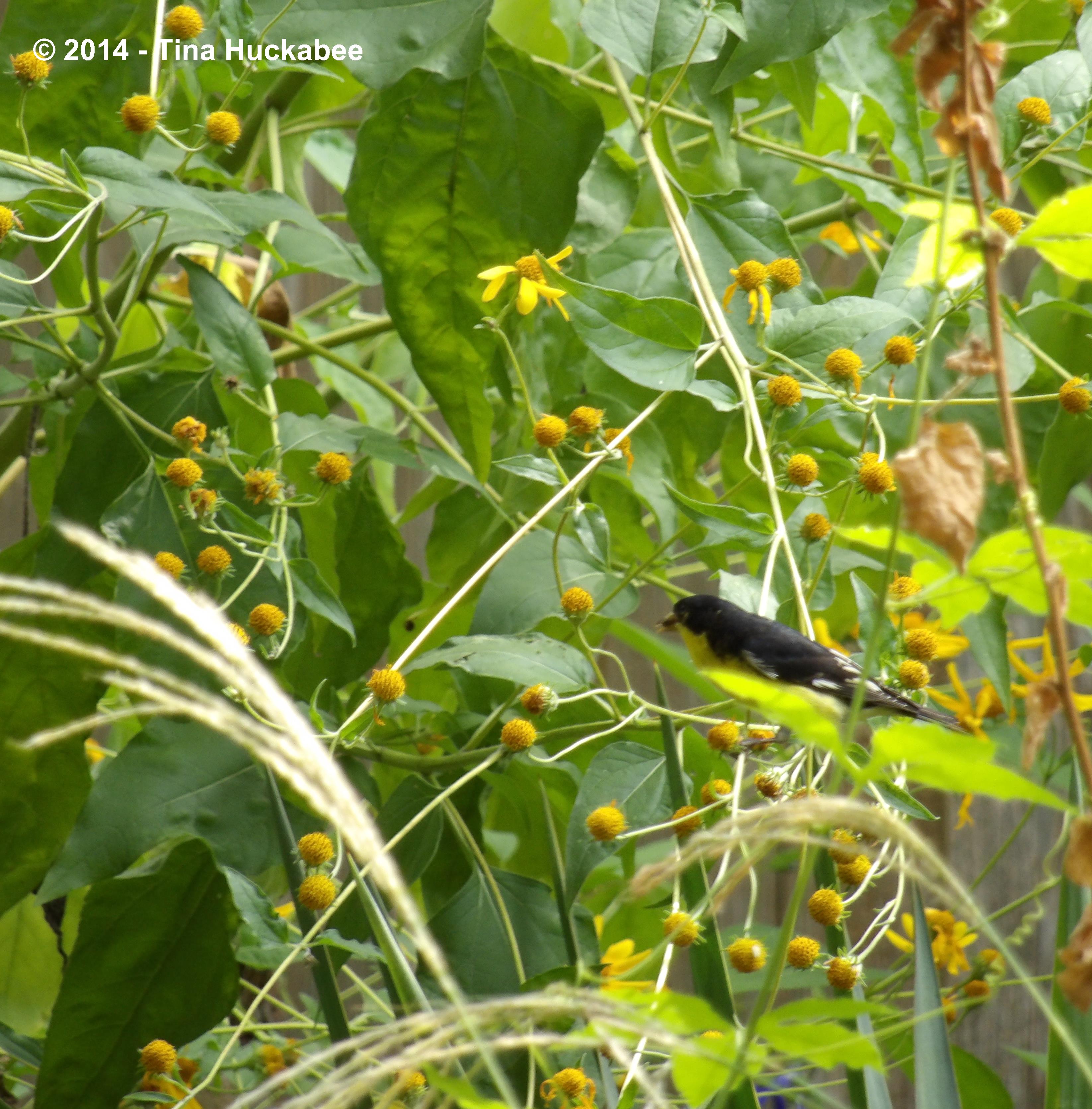 The Lesser Goldfinches, Spinus psaltria, descended on the Goldeneye as the flowers went to seed.