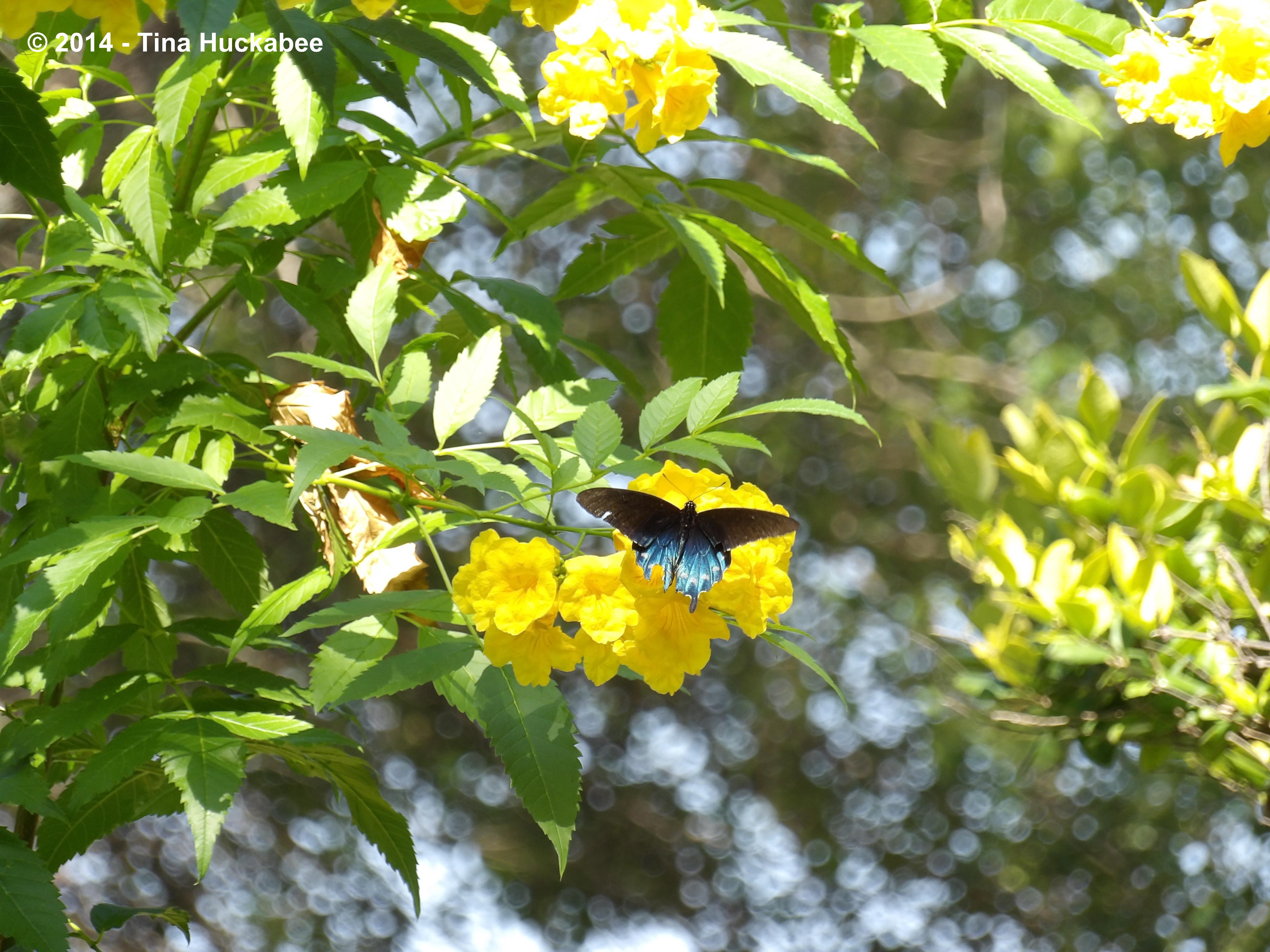 Common in Austin, the Pipevine Swallowtail, Battus philenor, is a high, strong flyer. Though this one,