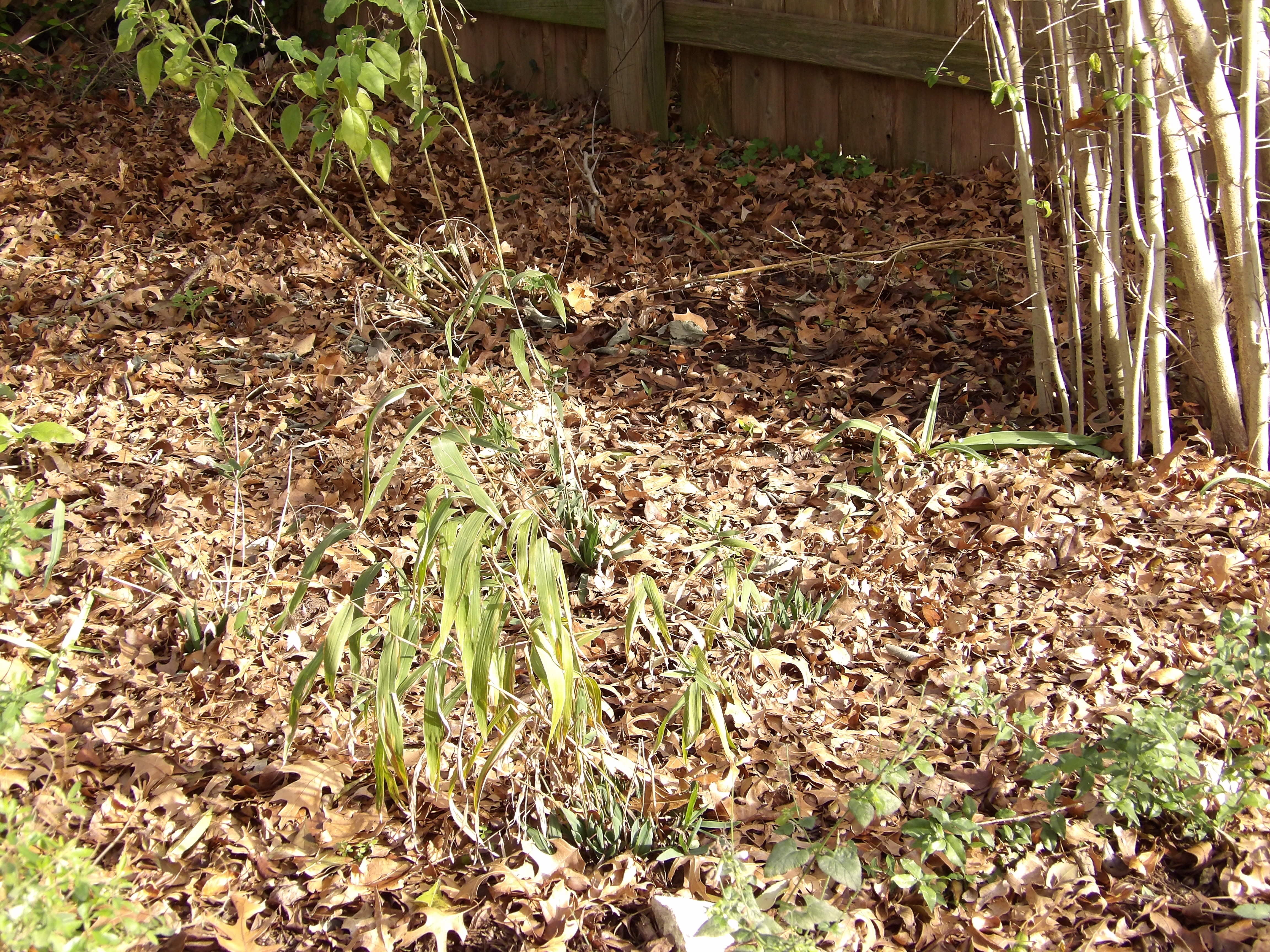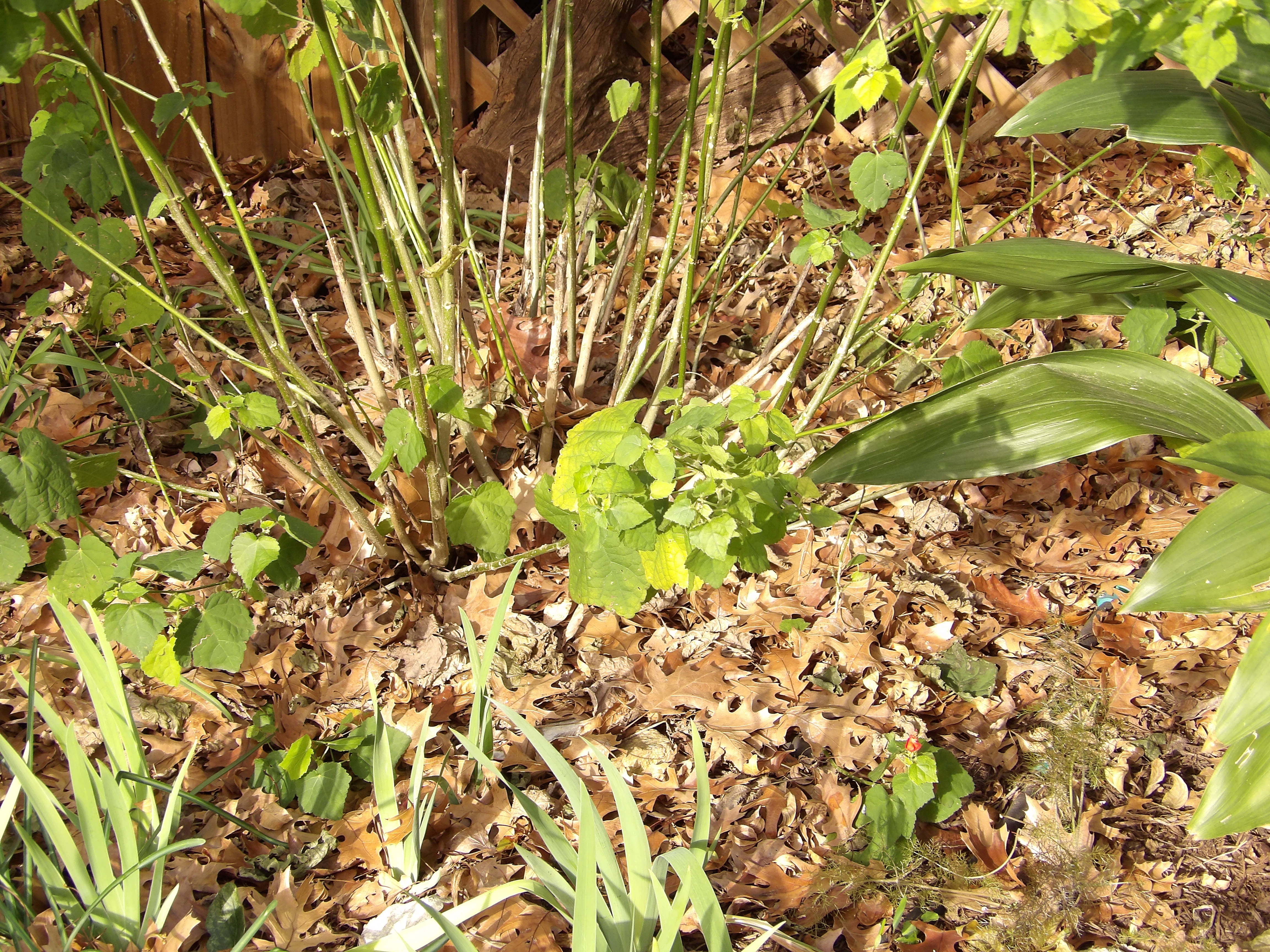 Except where I find them annoying (clustered ahead of the front and back doors, ready to hitch a ride on the dog’s fluffy tail or to get blown in with the slightest puffy breeze as the door opens), I allow leaves to stay on the ground to become leaf mold and to decay. That’s especially true in the wildscape part of my urban property which doubles as a work area.