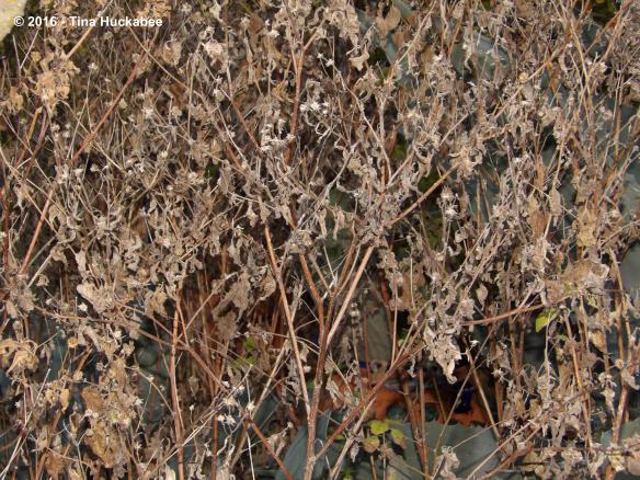 I typically leave my Goldeneye for as long as possible because I’ve read that finches will take strips of leaves for their nests as they prepare for spring breeding season. Also, there are often seeds available throughout much of winter for birds to snack on–and they do partake of those seeds. So, in spite of its skeletal, freezer-burned appearance, I keep mine around until mid-to-late February, or as long as I can stand to look at them.