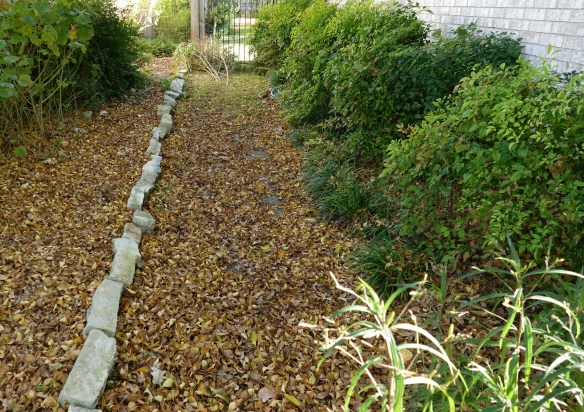 This fence between our properties is about three years old and some of “my” plants have already migrated over and under the wall, settling in for the flower show.
