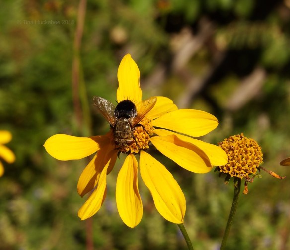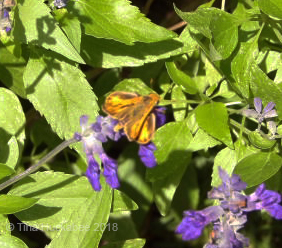 Camouflaged by color and quiet, this common butterfly only caught my attention with slight movement as it work about its floral dinner table. Often more yellow and regularly in rapid flight, this one was gentle in motion as it nectared on the Prairie goldeneye bloom.