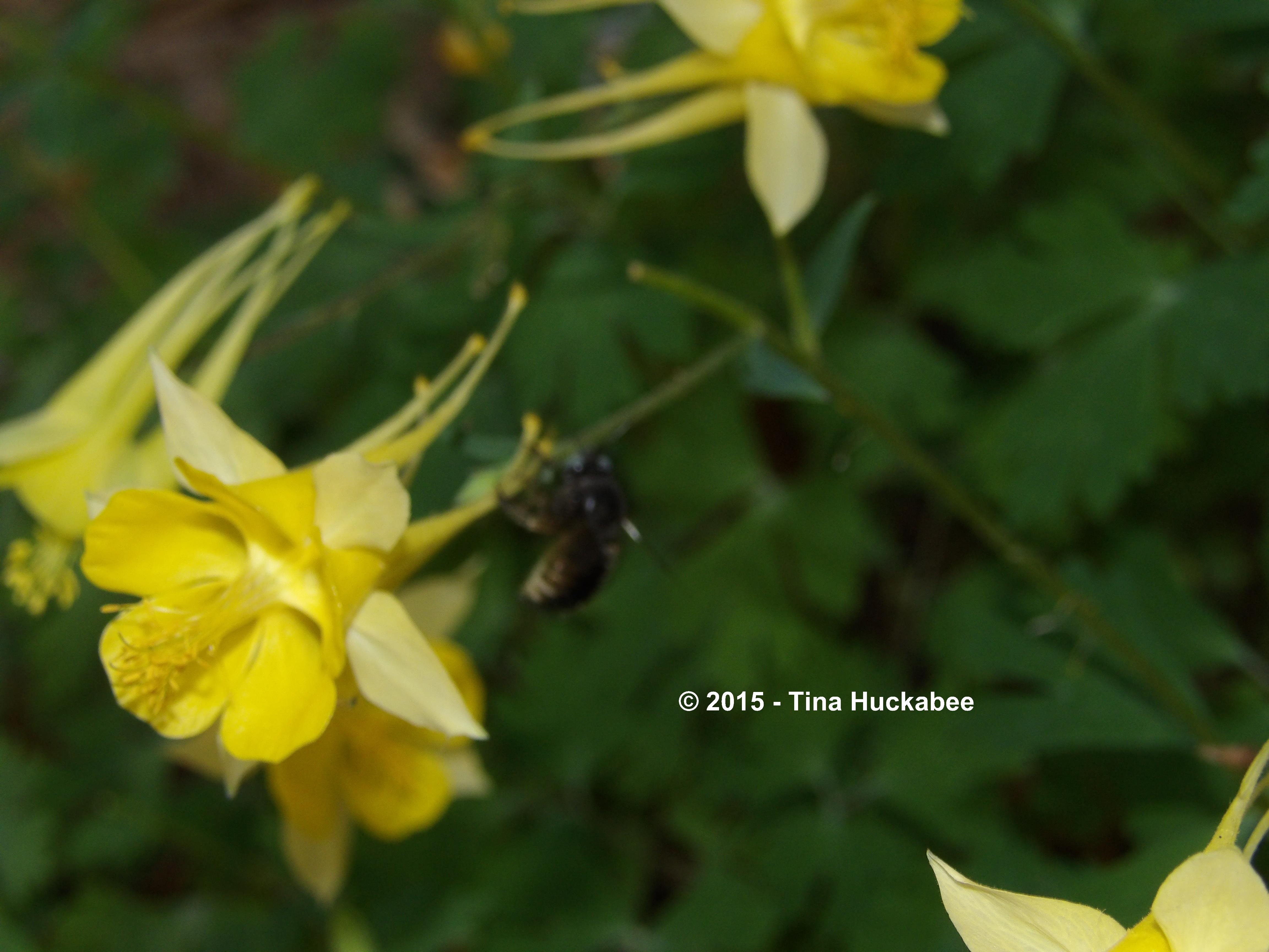 The flowers are pollinated by bees, butterflies, and moths and I’ve seen hummingbirds visit mine.The nectar spurs are a characteristic feature of all Columbine species.The long nectar spurs evolved to meet the needs of pollinators like hummingbirds and hawkmoths and probably little bees like this one, too.