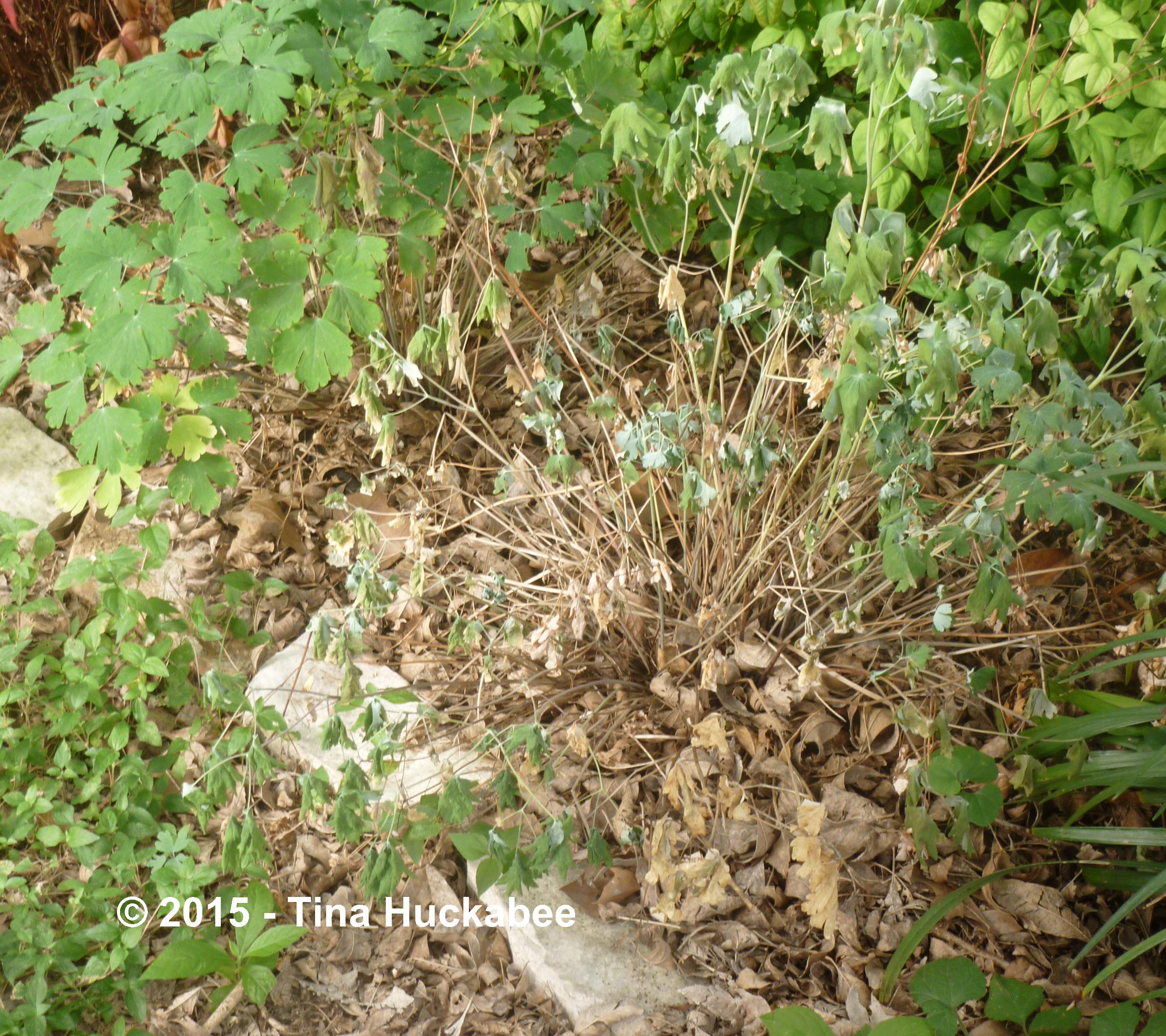 Summer is the time for Texas Columbines to rest. Columbines are at their tallest and fullest during spring–individual plants grow as much as 3 feet tall and 2 feet wide, including flower stalks. But as summer wears on and the bloom stalks dry and are pruned, the Columbines will shrink in size and more than likely, experience some foliage die-back. During the summer months, wilted and discolored foliage is not unusual.