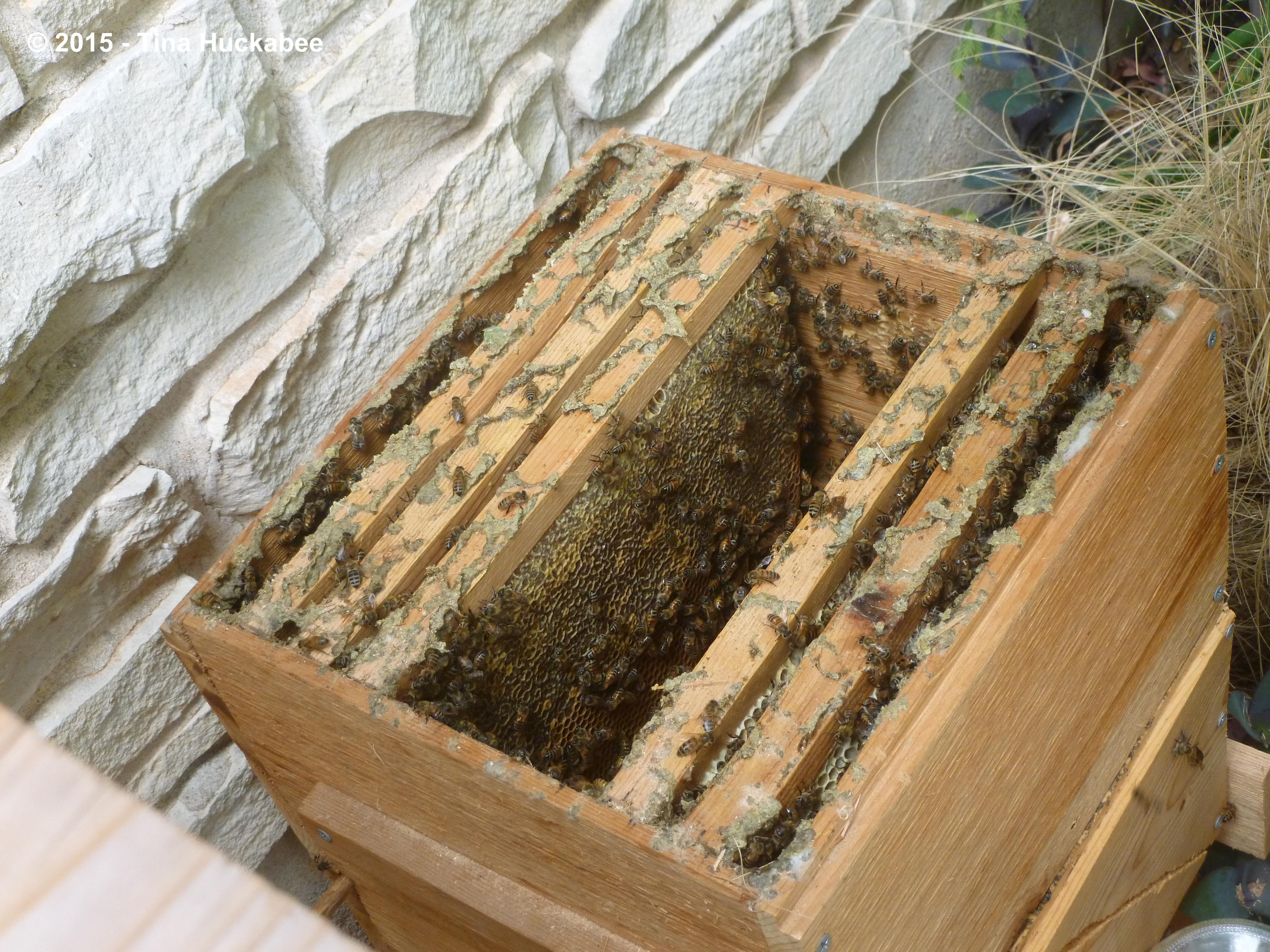 We did lose a fair number of bees initially, about 2-3 cupfuls. How does one count bees?? I think that’s normal and there is constant and natural attrition to bee hives–that’s why there are undertaker bees in hives–to remove dead and dying bees. Also, bees are known to fly out of the their hive in altruistic suicide missions–to die outside the hive so as not to infect the others. Aren’t bees grand?