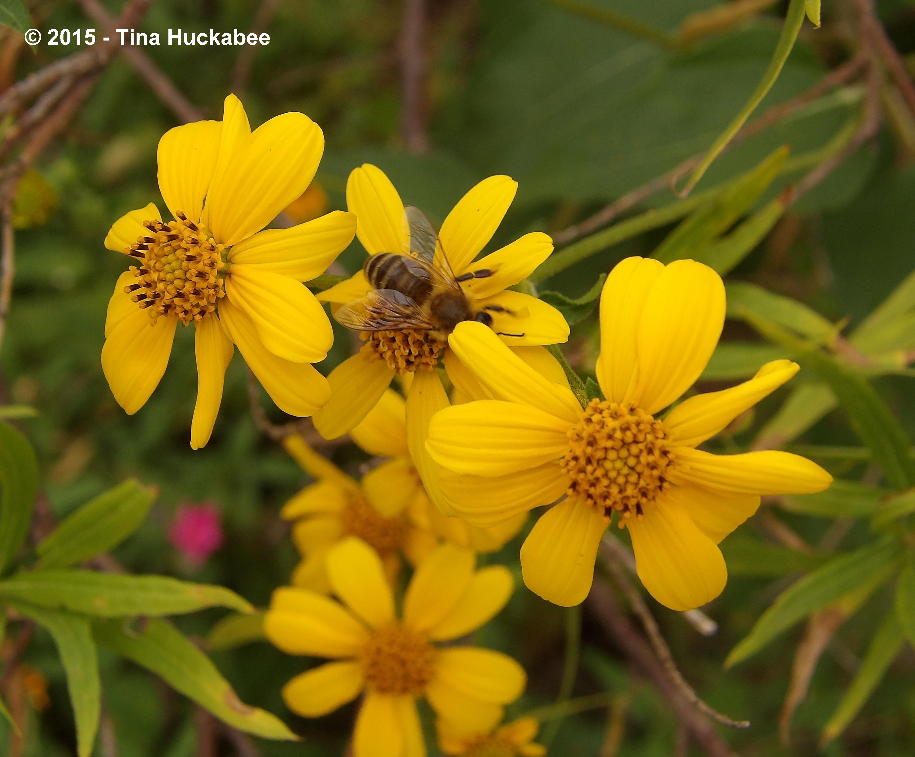 Honeybees are all over the flowers and even finches are in on the buffet, as flowers fade and seeds appear. Check out the orange pollen on this bee gal’s corbiculae, also known as pollen baskets, or in Tina-speak, pollen pantaloons. The pollen pantaloons on this bee are the puffy orange pillows situated on either side of the bee.