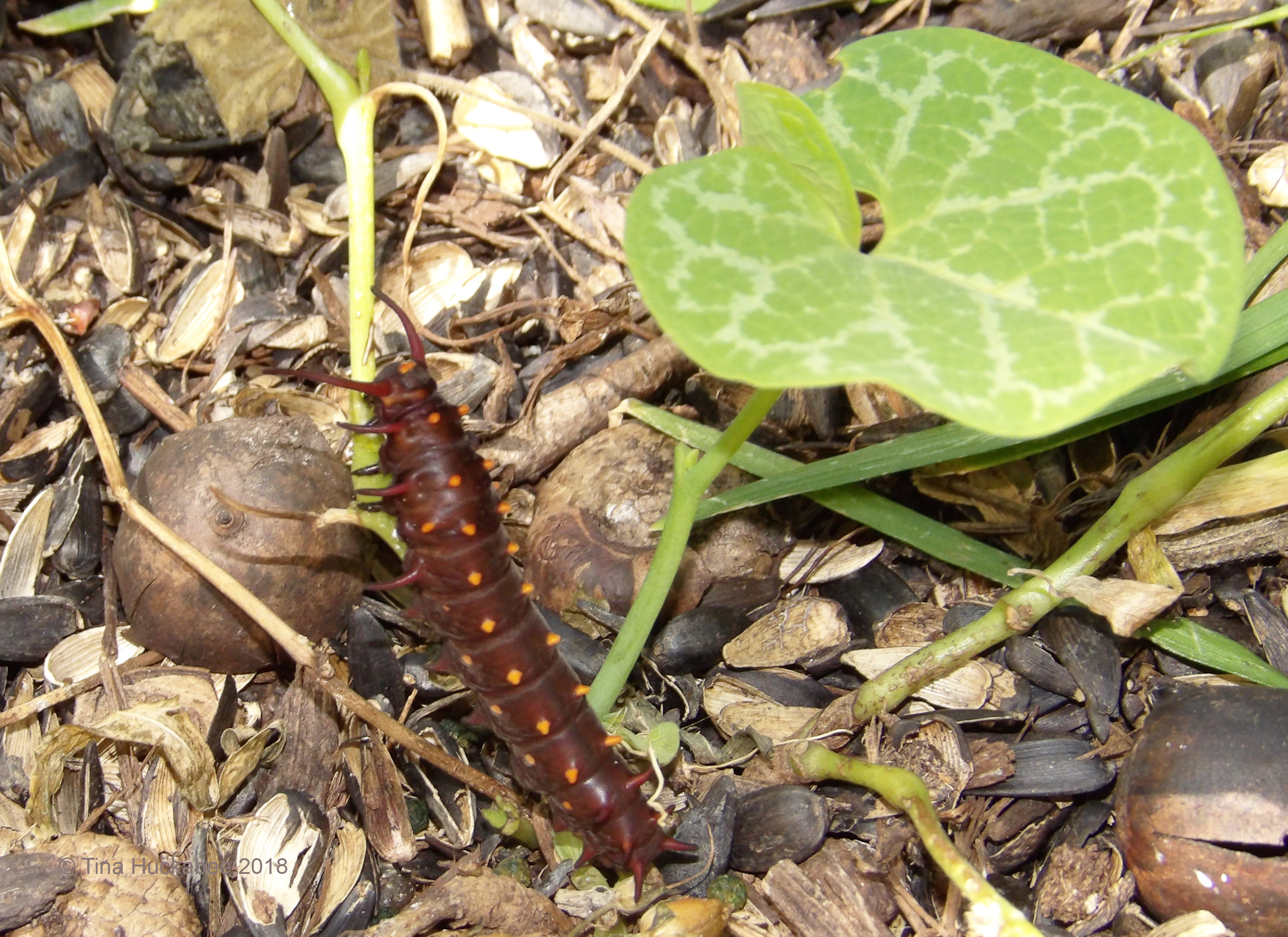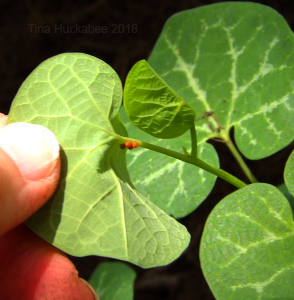 Yum, yum–Dutchman Pipes taste good to Pipevine Swallowtail larvae! Within a few weeks and assisted by some lovely, welcomed rain in June, all three plants have emerged–lush-n-leafy–after providing meals for that first batch of caterpillars.