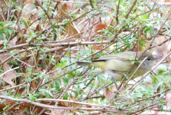 Orange-crowned Warblers sing a sweet cheep cheep and that’s usually how I find them in the oak trees. They favor flitting through the shrubbery, snipping off insects and are more reticent at the feeders than either the Butter Butts or the Ruby-crowned Kinglets.