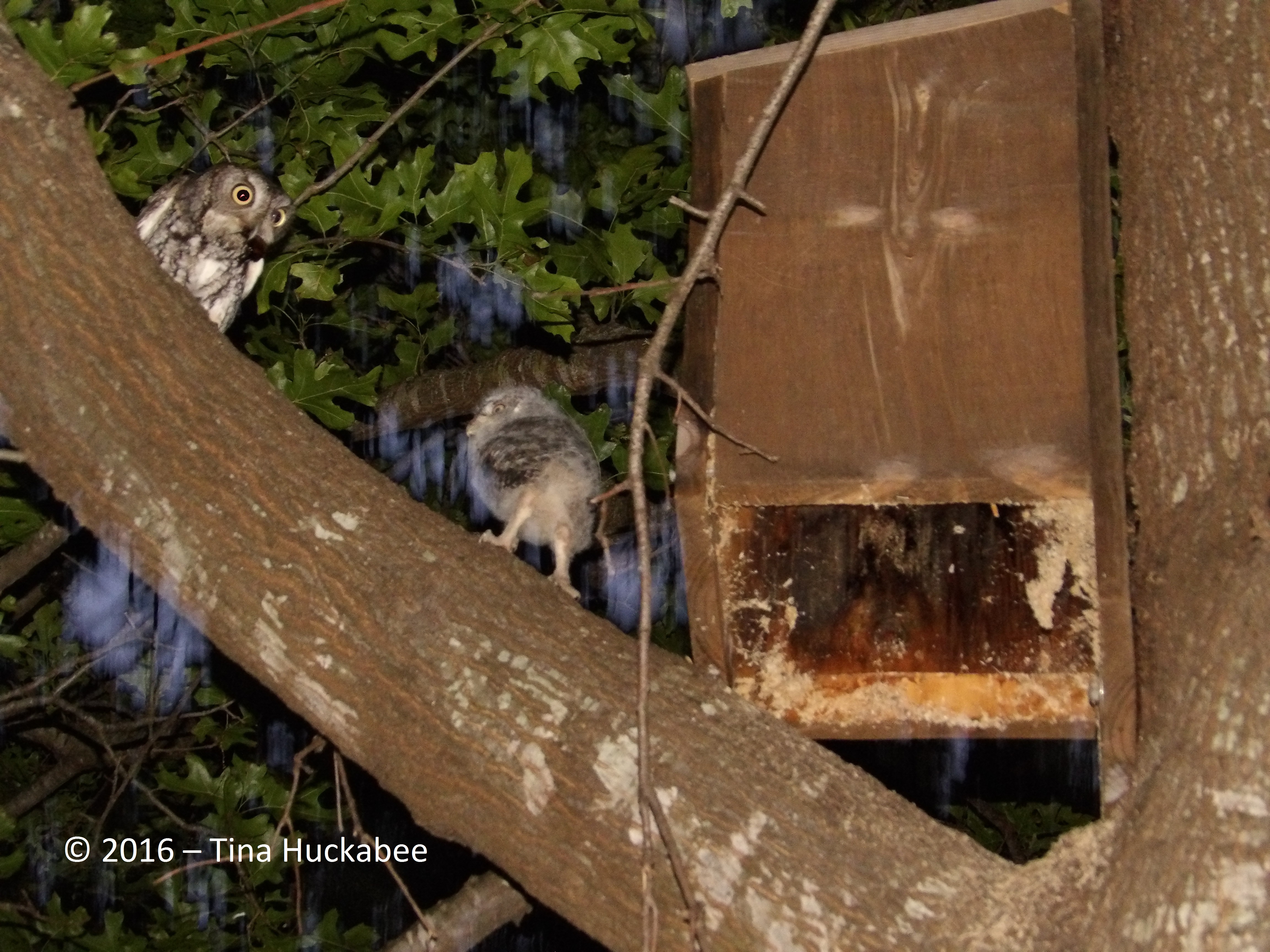 I didn’t expect that Fuzzy’s first steps into the great outdoors would occur that evening, but I was wrong–I guess little owls know best. I saw Daddy Owl swoop in front of the box, trill while carrying what looked like a dangly and juicy worm, and baby hopped right out of the nest box and onto the branch to greet Dad, the worm, and the outside world.
