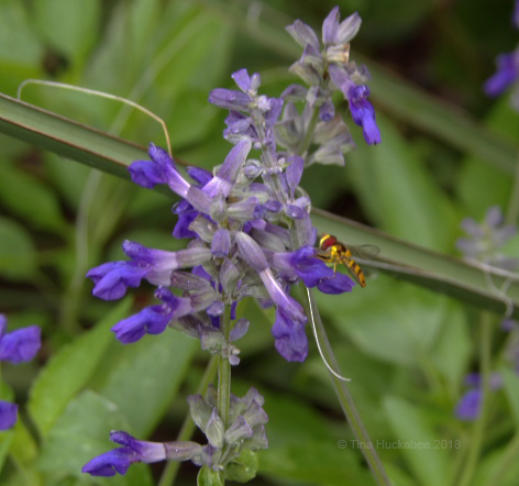 Syrphid flies also appreciate the blue, working during rain breaks, the blooms of Henry Duelberg