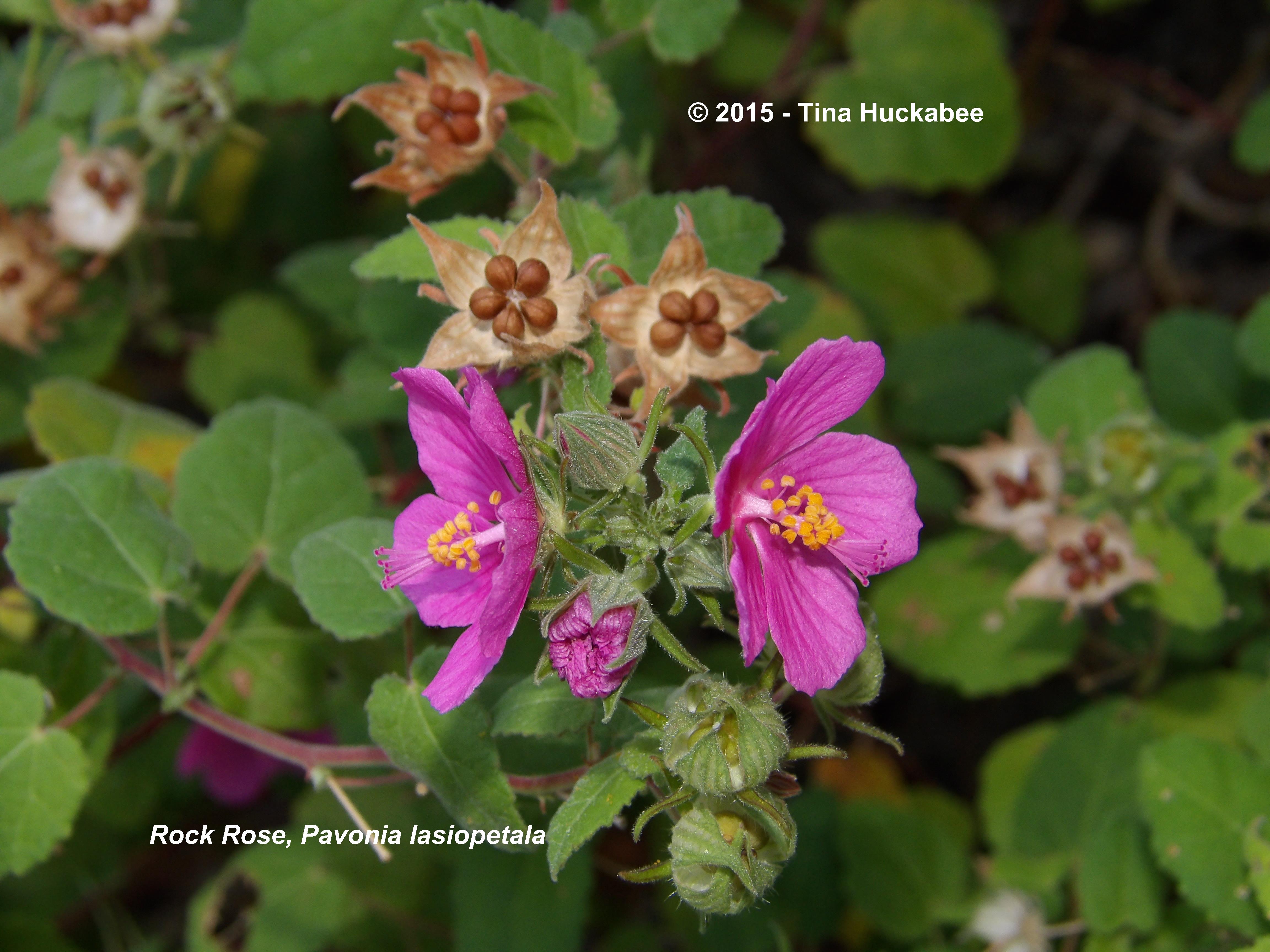 Rock rose (Pavonia lasiopetala) is a long-blooming perennial shrub and a huge favorite of the pollinator crowd.