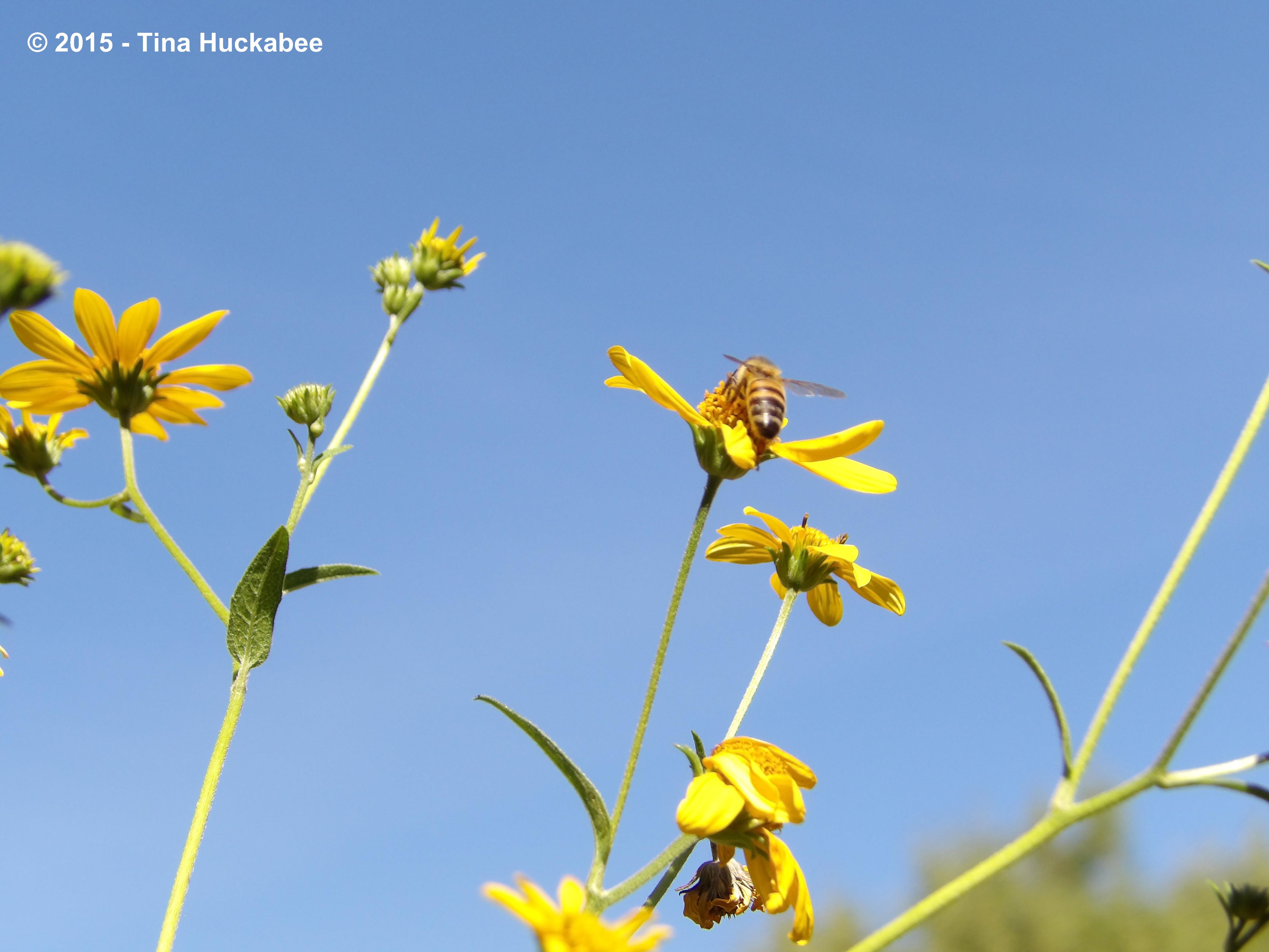 Sunny Engelmann’s daisy (Engelmannia peristenia), paired with Henry Duelberg sage (Salvia farinacea ‘Henry Duelberg’). Buzzily nectaring native Carpenter bee–bonus treat!