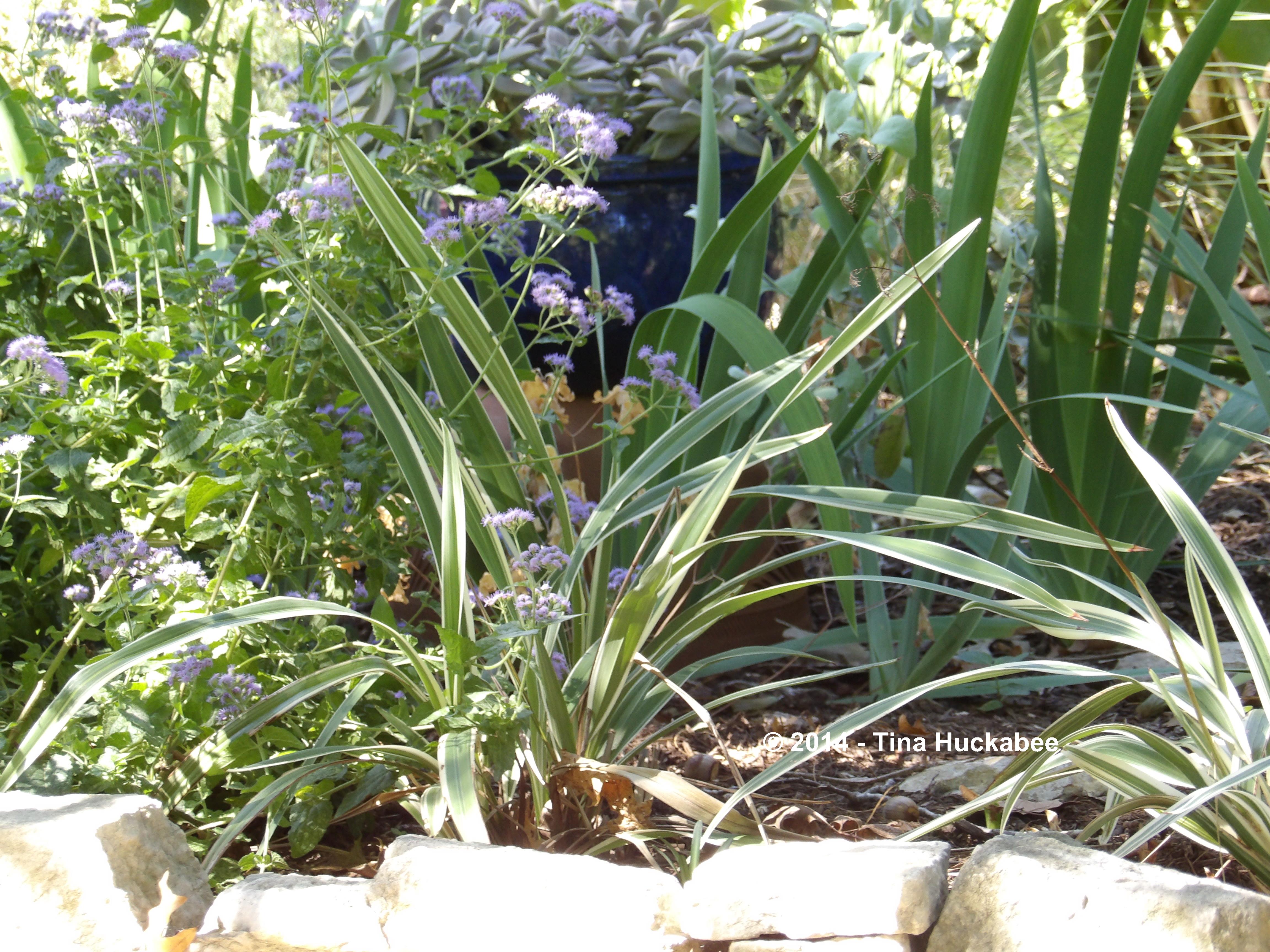 In one corner of my garden with dappled light most of the day and some direct sun off and on, are a couple of favorite foliage vignettes.  One such is of Iris straps, Blue MistflowerConoclinium coelestinum,  and cobalt-blue containerized succulent Ghost Plant, Graptopetalum paraguayense.
