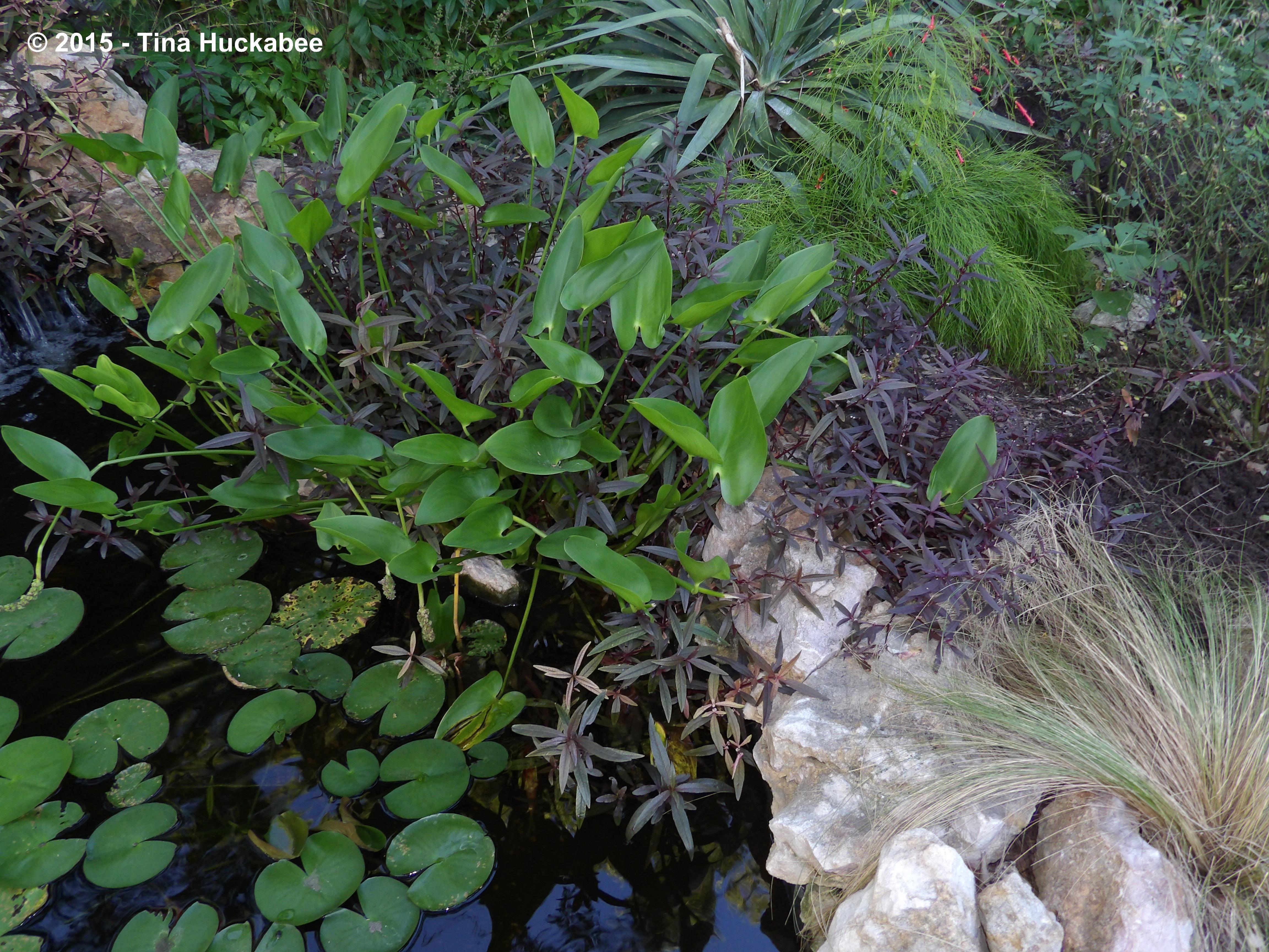 Lots of foliage action in this shot!  Clockwise from the bottom, the actual water plants include the lily pads of the two lilies I grow (Colorado and Claude Ikins), the Ruby Red Runner, and the showy leaves of the Pickerel RushPontederia cordata.   All three pond plants contribute to the biological filtration of my pond, though I also have a mechanical filter.