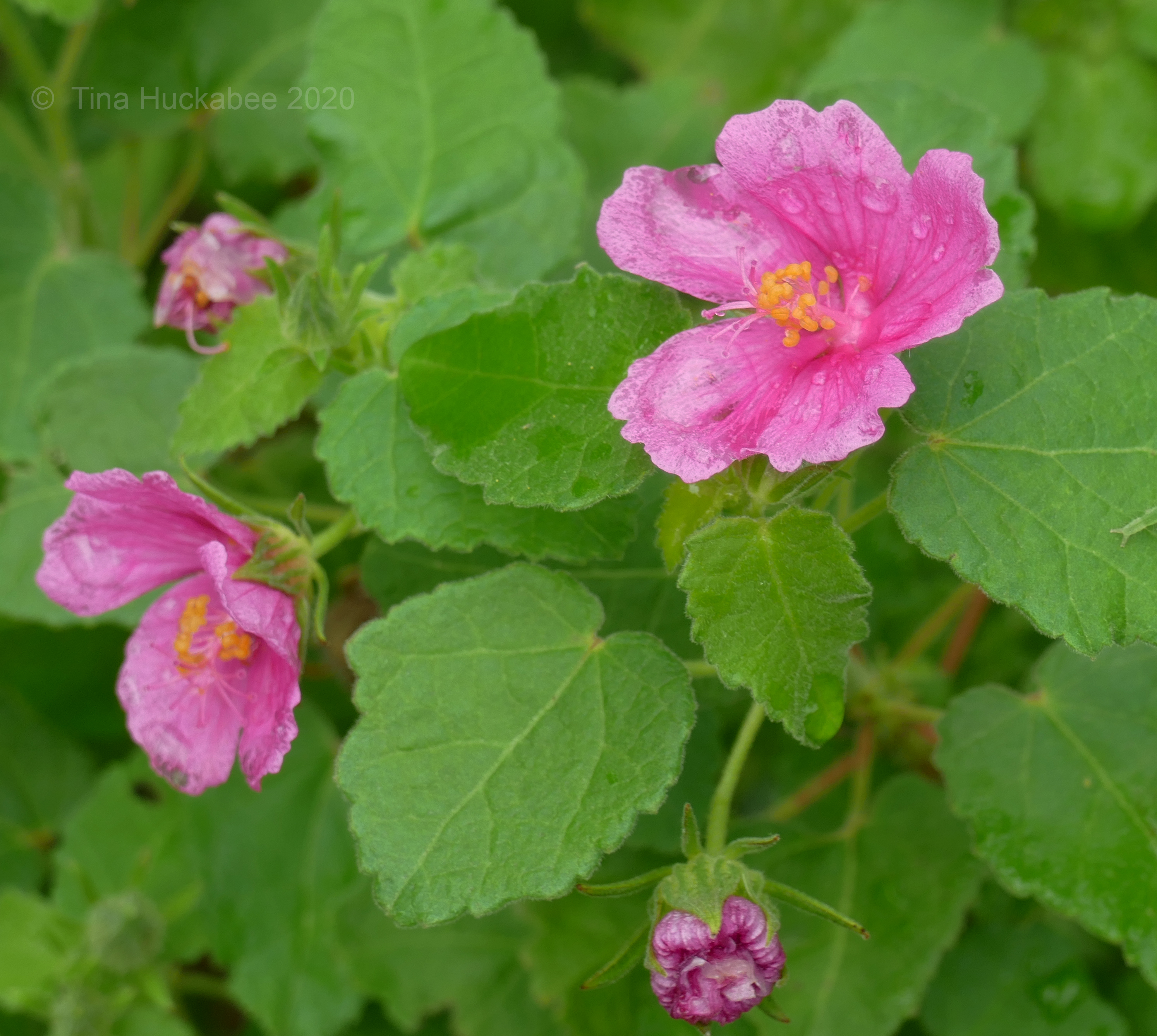 Rock rose, Pavonia lasiopetala, rests during July and August, gifting to the gardener only a stingy few shockingly pink delights during those hot months. But add a little rain and the pink petals produce a pow-wow.