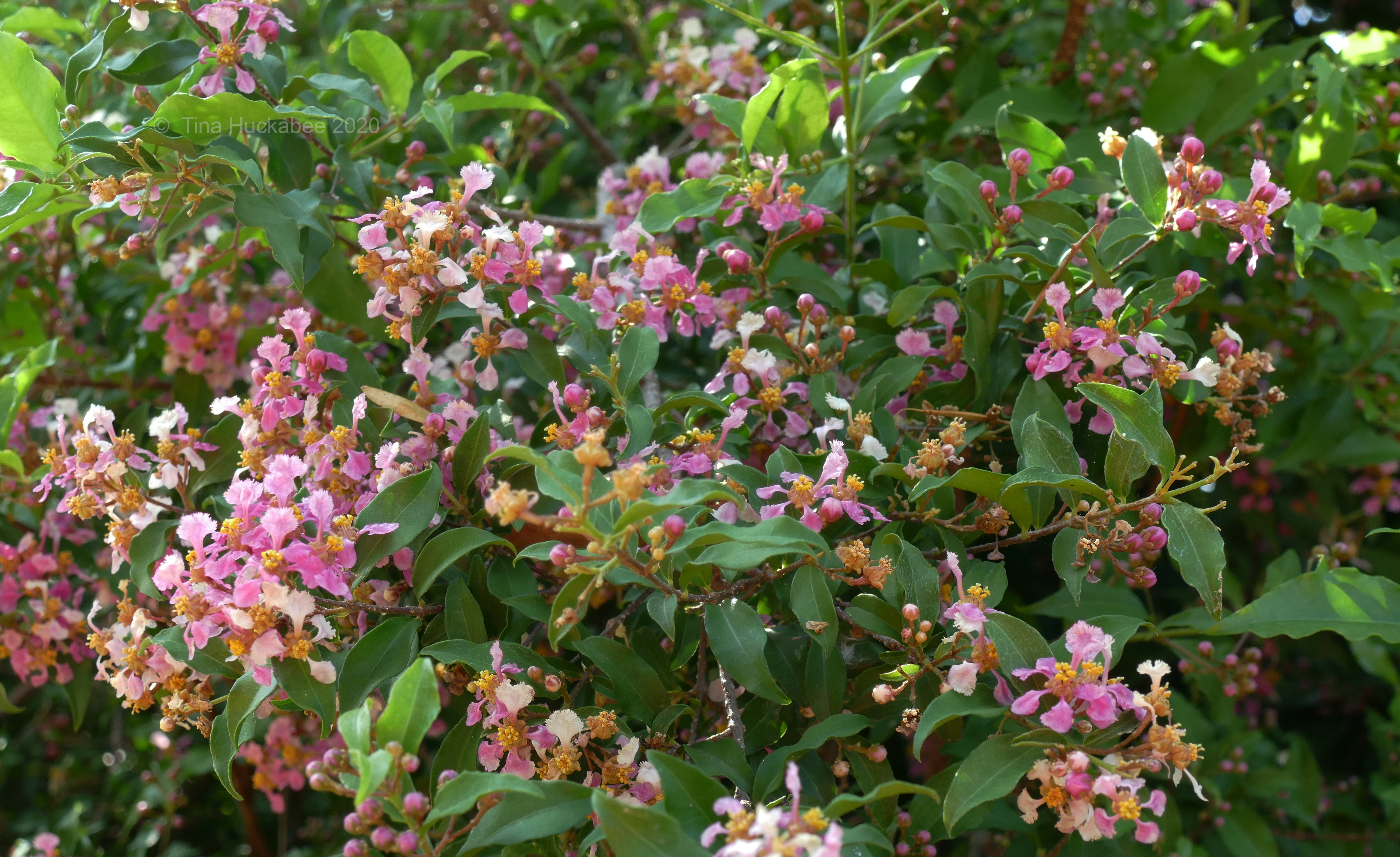 Busting out is also a good description of the masses of frothy pink bloom clusters that Barbados cherry, Malpighia glabra, produce after some needed precipitation.
