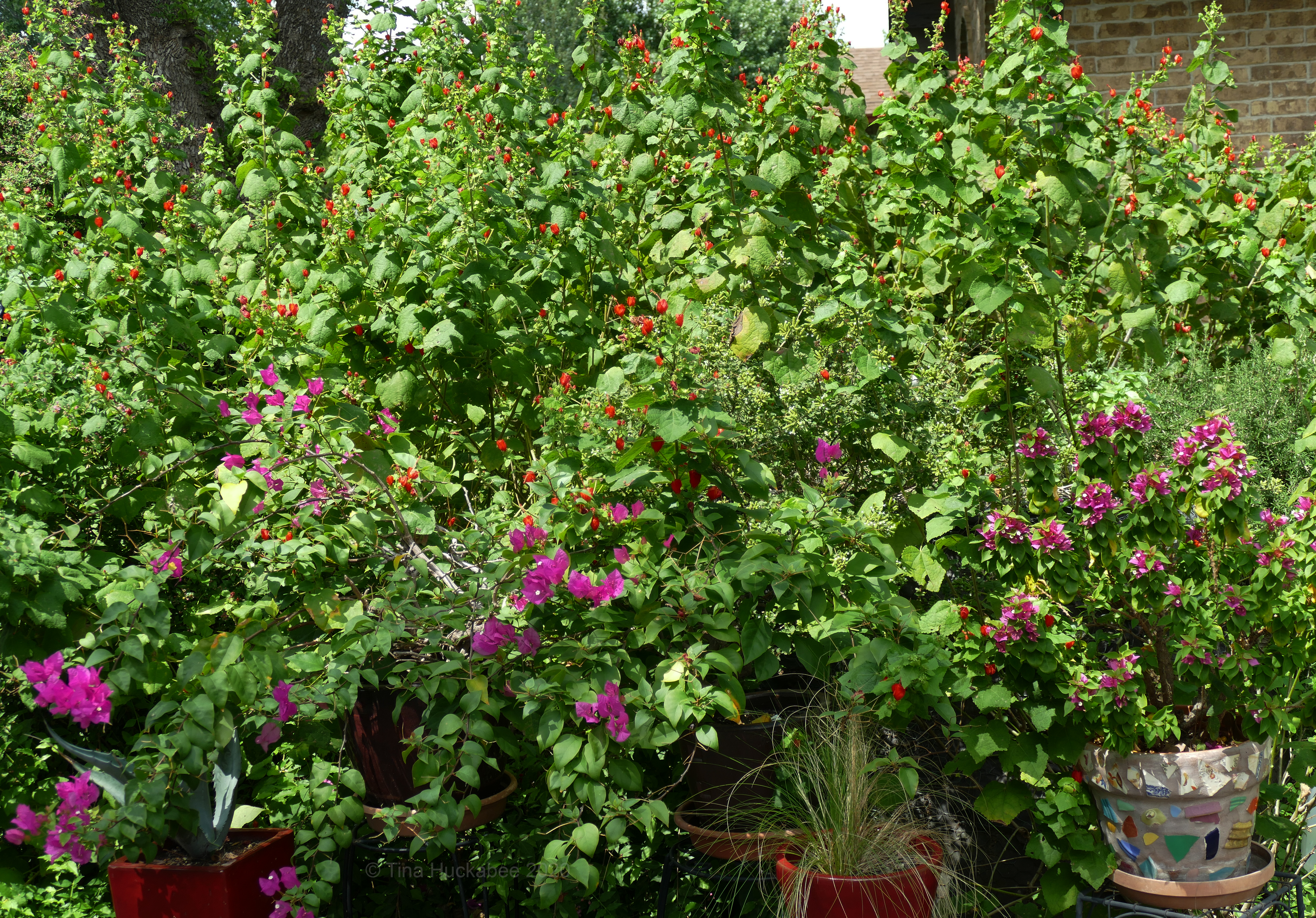 Accompanying the Turk’s cap during the long growing season are potted bougainvillea, a Mexican feather grass, and an American agave–sun worshipers, all.