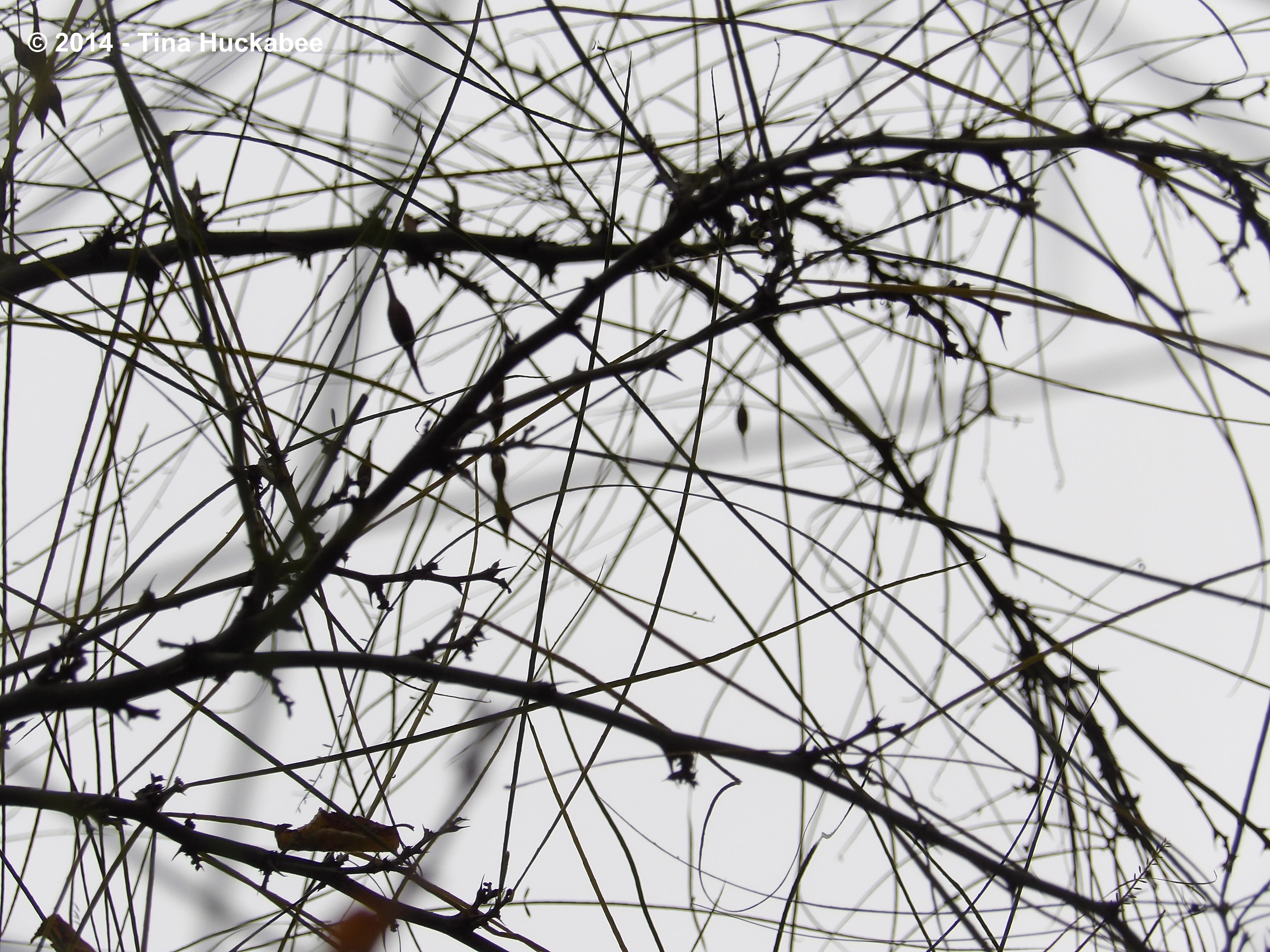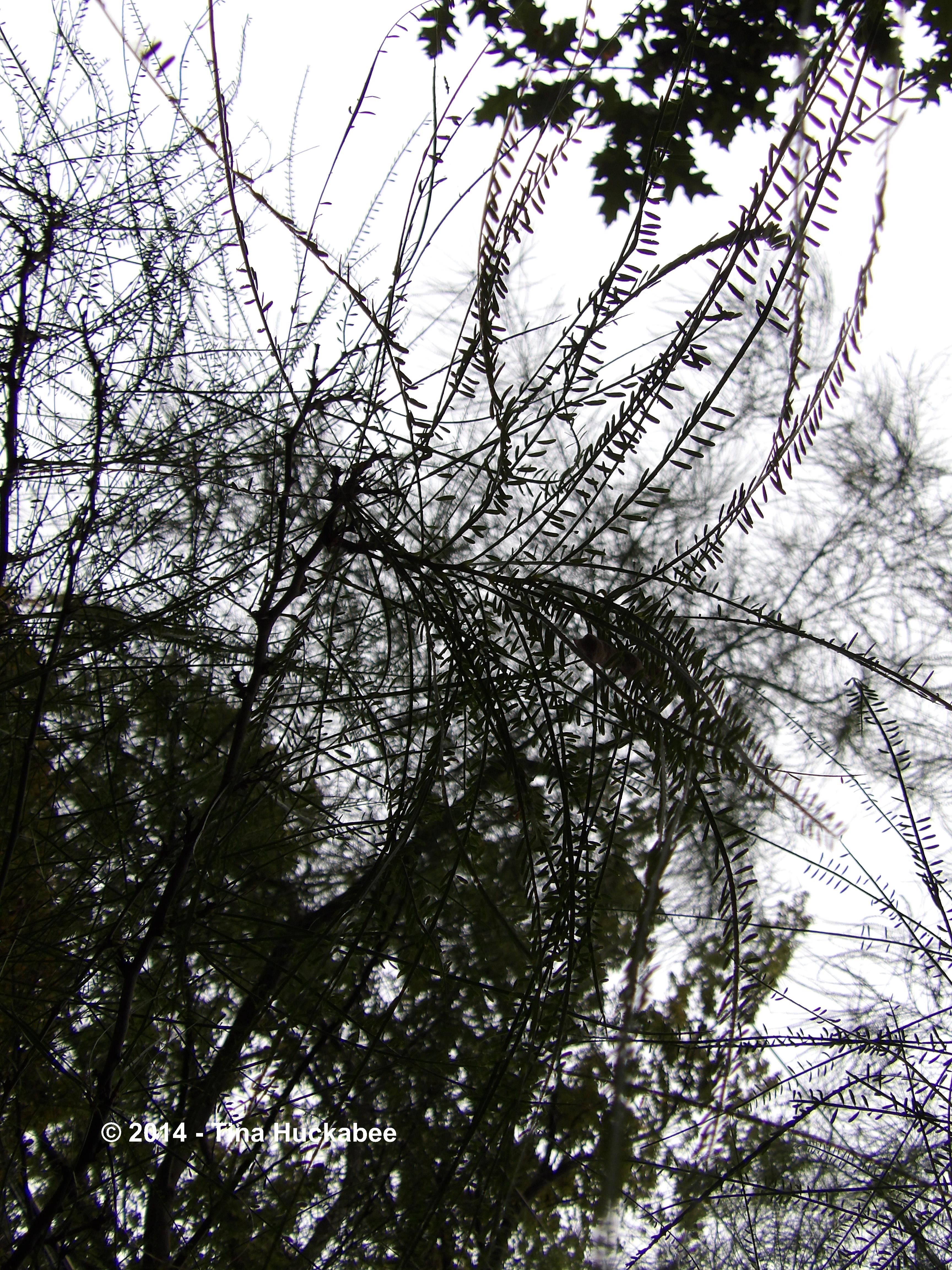 Not sticks though, these are leaves, commonly referred to as “stalks.” The leaf structure of the Retama is unusual–a botanist would describe it as bipinnately compound; there are two stalks from an axis and each stalk has series of tiny leaflets arranged on either side of the stalks. Most of the stalks and leaflets from my tree have dropped, but you can see remaining ones in silhouette against the sky.
