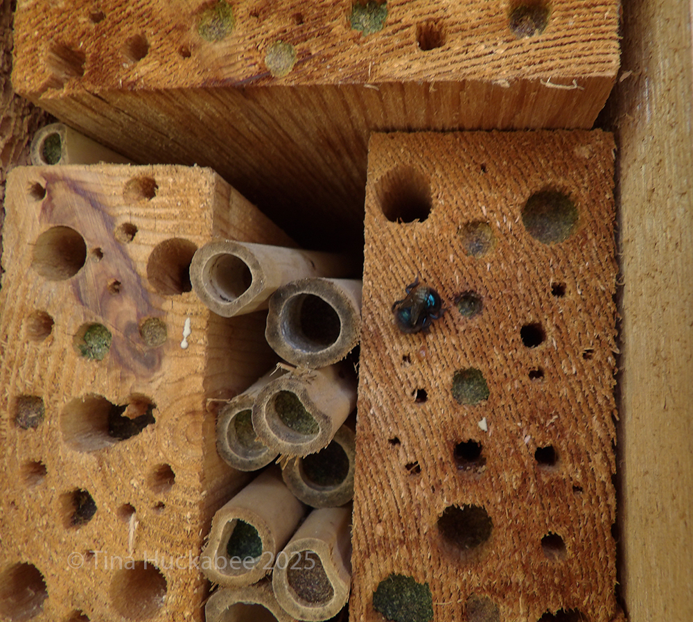 Native bees are generally solitary and nest only for their offspring, unlike honeybees who nest in large collectives. Native bees nest in the ground, in wood, and older stems of plants. You can help natives find spots for reproduction by leaving some wood in your garden, by allowing some soil to remain bare, free of plants, mulch, and ground-cover, and also by delaying winter pruning until just before spring growth. You might also want to build bee “houses” or “hotels” which will provide space for many bees to nest.