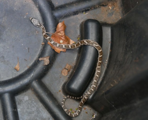 A young Texas Rat Snake, Elaphe obsoleta lindheimeri, I imagine it’s the offspring of a adult snake that I saw in June. Several times, the Blue Jays were yelling at something in the back corner of my garden. I’d investigated, assuming that they were screaming at an owl, but they were looking down at the ground and not up into trees. After several inspections driven by the jays’ caterwauling, I finally I saw a bit of a good sized snake. The snake was mostly nestled under groundcover, but enough was visible showing a circumference several inches, meaning that the snake is most likely 5-6 feet long. I left the snake alone, not out of fear, but because rat snakes are good predators to have in the garden.