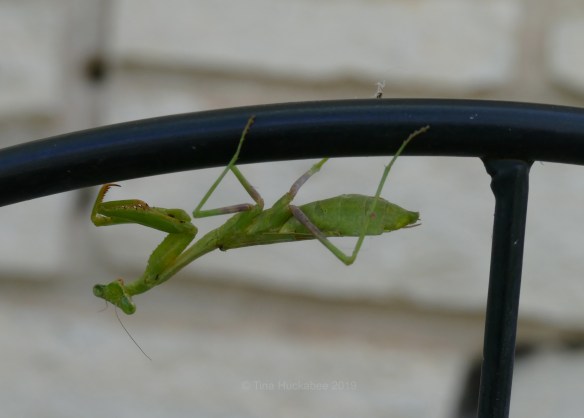 Mantids eat a variety of things, most of which are smaller than themselves, including honeybees. Flies, butterflies and moths, as well as other insects are also on the mantid menu. When I checked the next morning, the mantid was gone from this spot, but is probably nearby.