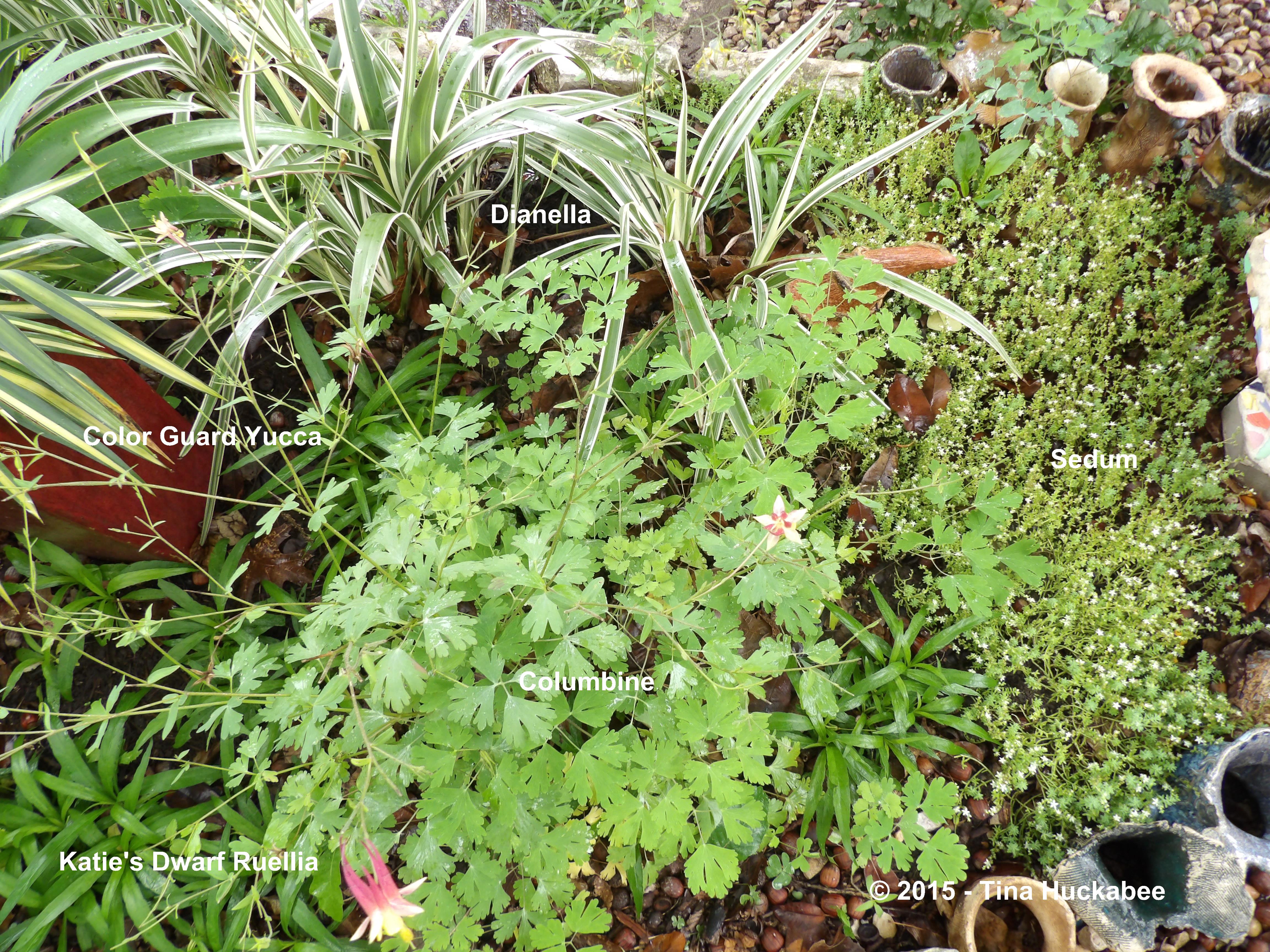 It’s a mixed-bag of foliage characters, including white-stripey Dianella/Variegated Flax Lily, Dianella tasmanica ‘Variegata’, Katie’s Dwarf Ruellia, Ruellia ‘Katie’, and Columbine, Aquilegia. This particular Columbine is one of the natural hybrids of my A. canadensis and A. chrysantha. Photobombing on the far left is a containerized Yucca filamentosa, ‘Color Guard’ and some Iris straps, and spreading its succulence in the remainder of the bed is a creeping Sedum, probably Sedum diffusum ‘Potosinum’, though it’s a passalong to me from a friend, so I’m not positive of its identification.
