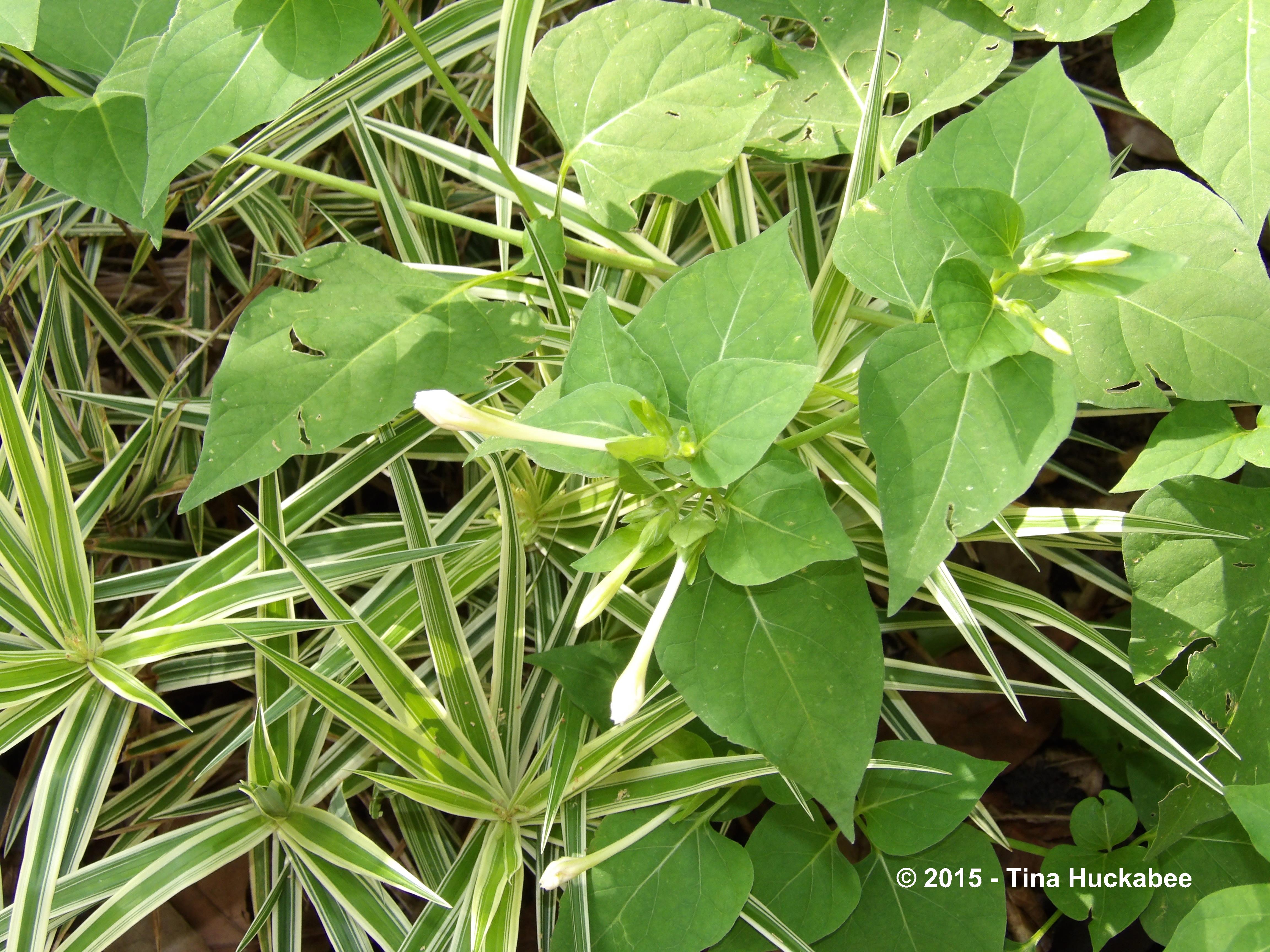 The happy pairing of the structural and evergreen Sparkler Sedge, Carex phyllocephala ‘Sparkler’ and white-blooming, herbaceous Four O’Clock, Mirabilis jalapa, is garden serendipity.