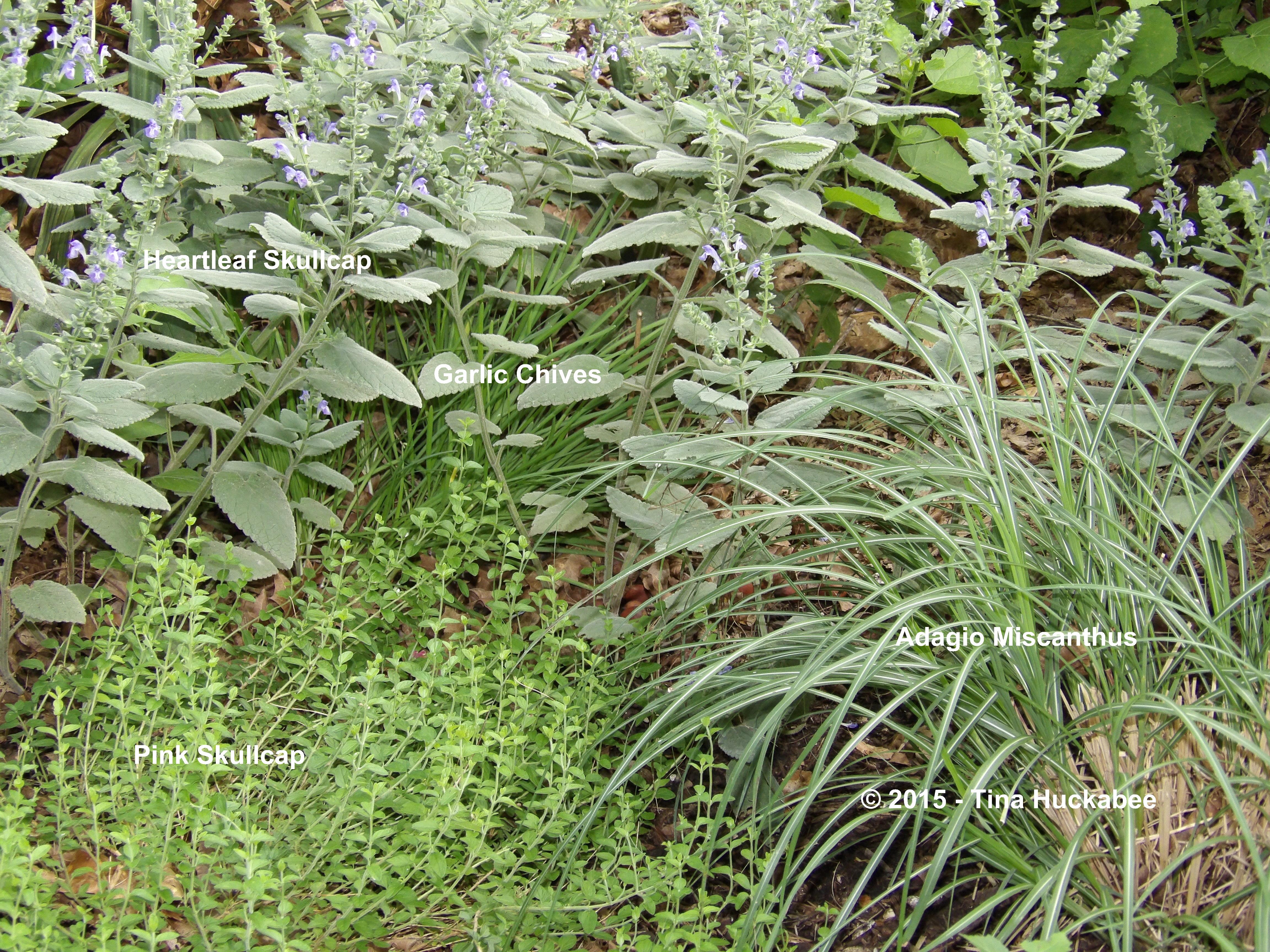…and the maiden–grassy Miscanthus sinensis ‘Adagio’. Hiding underneath the Skullcap is a clump of Kelly green, aromatic, and fleshy Garlic Chives, Allium tuberosum.