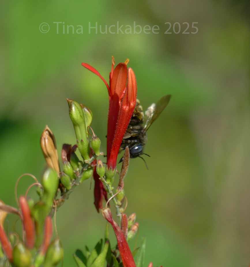 Bum-up view of the nectar-stealing, nectar-sipping bee. While direct pollination isn’t happening, you’ll notice grains of pollen sprinkled on Ole Blue Eyes’ body. It’s likely that some of those grains will play a role in pollination.