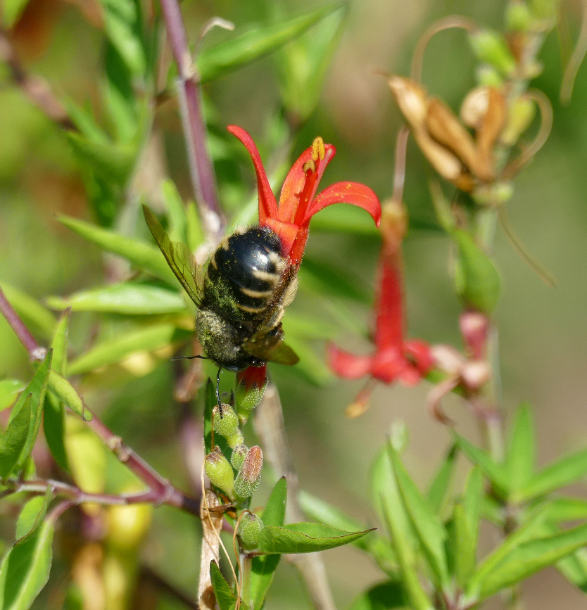 This Horsefly-like Carpenter bee, Xylocopa tabaniformis, worked the prolific blooms of a Flame Acanthus, Anisacanthus quadrifidus, in my front garden.