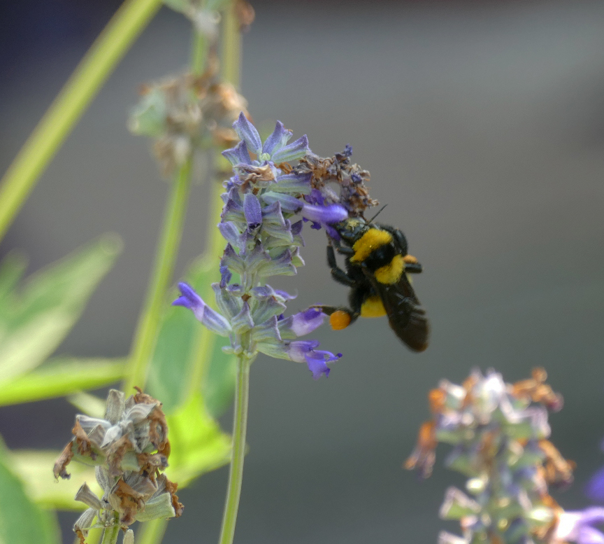 The other bees I’m seeing more of–and a big Huzzah! for that–are American Bumble bees, Bombus pensylvanicus. These graceful, yellow-n-black sweethearts are working many kinds of flowers right now, but a favorite bumble dining spot are the blue blooms of Henry Duelberg Sage, Salvia farinacea, ‘Henry Duelberg’. Notice the pollen booty on this bee’s pollen pantaloon, also known as a corbicula. If you look carefully, you can see a dab of golden on the other side of the bee–no doubt that pantaloon also carries a load of pollen.