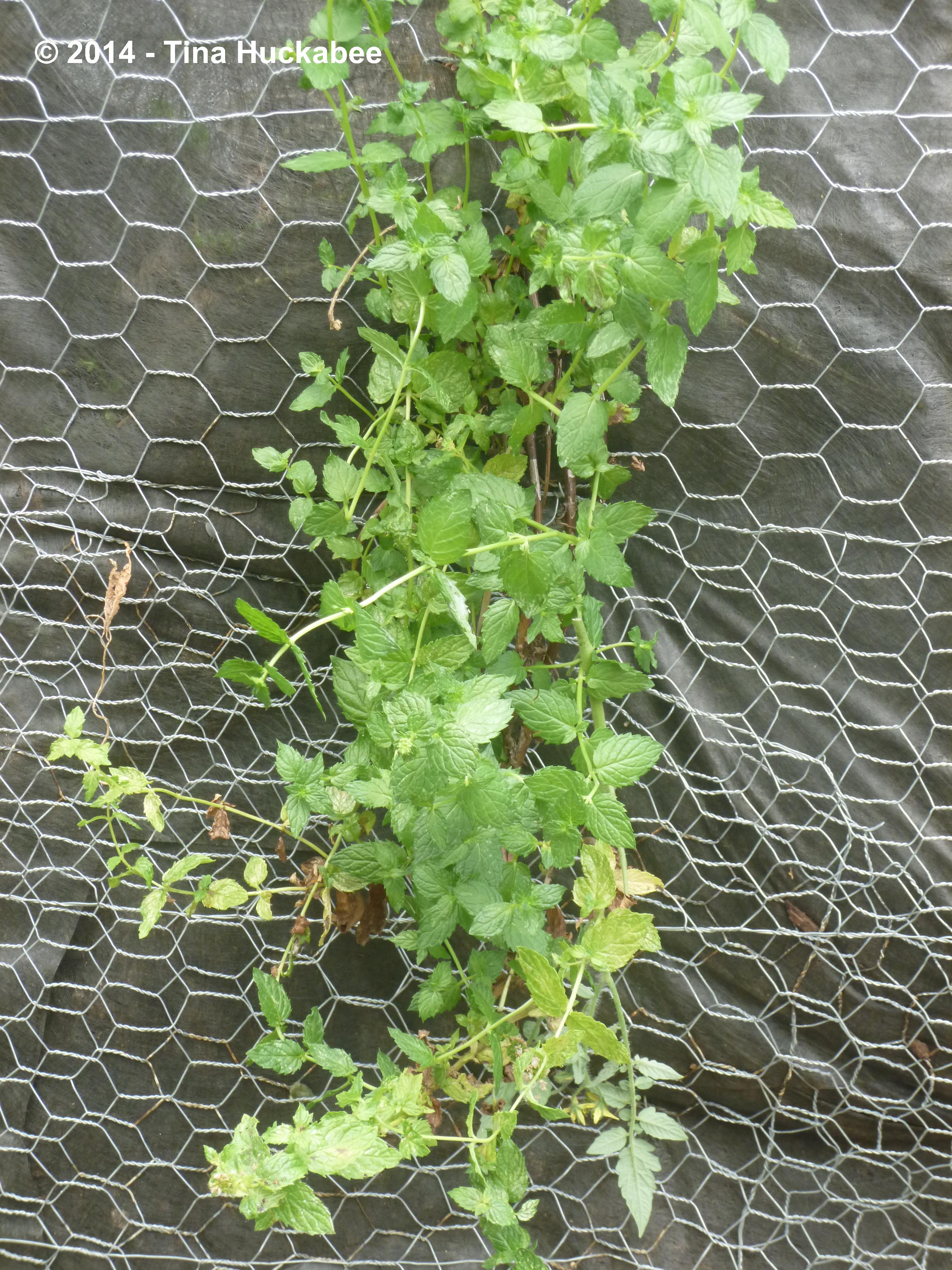 We did the same with chicken wire–wrapped it around the frame and wired it through the landscape fabric and to the frame. Because the frame is larger at its base (4’X3′) than at its top ( 3’X3′). some folding of the landscape fabric and crimping of the chicken wire is necessary to fit well around the frame.