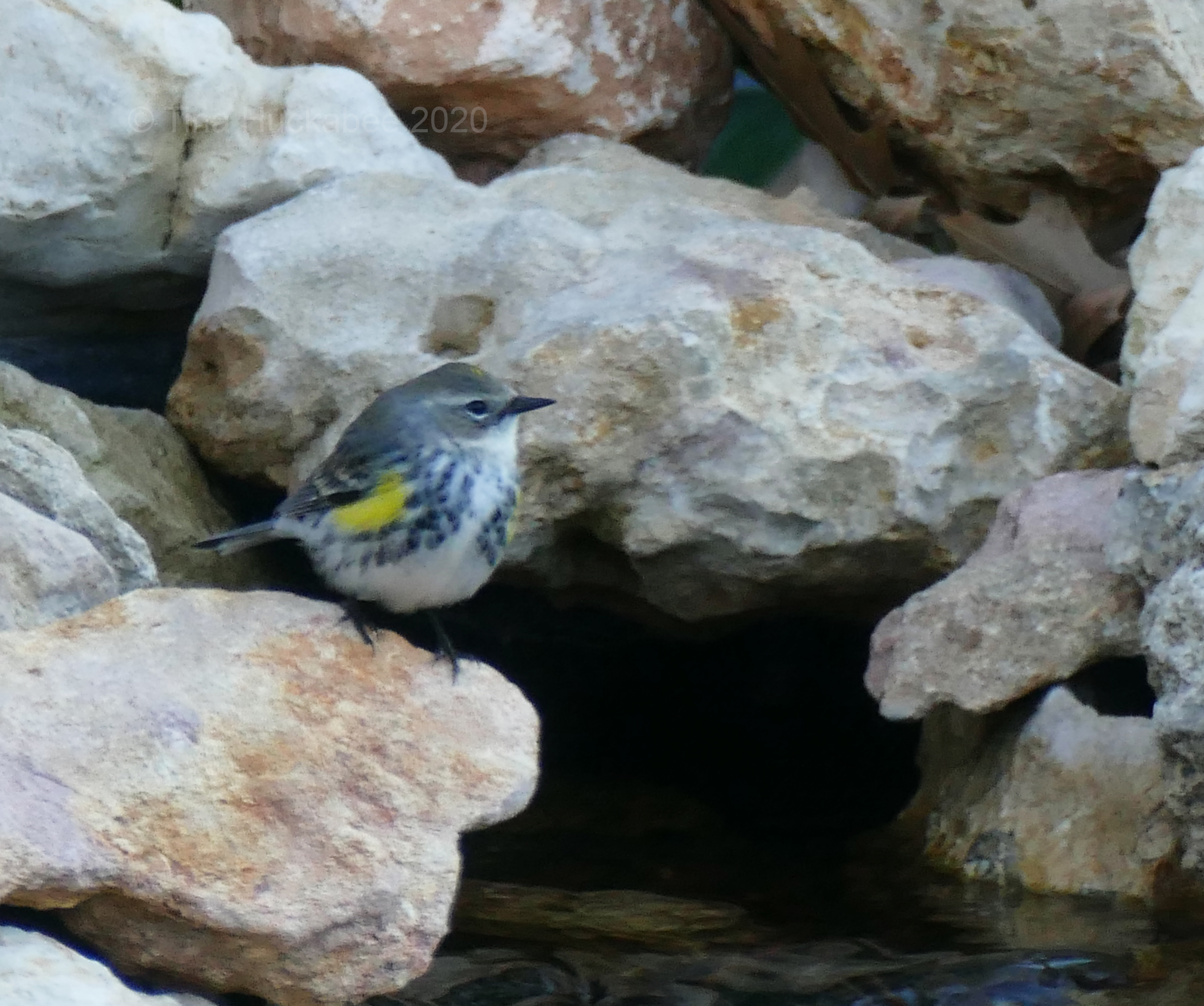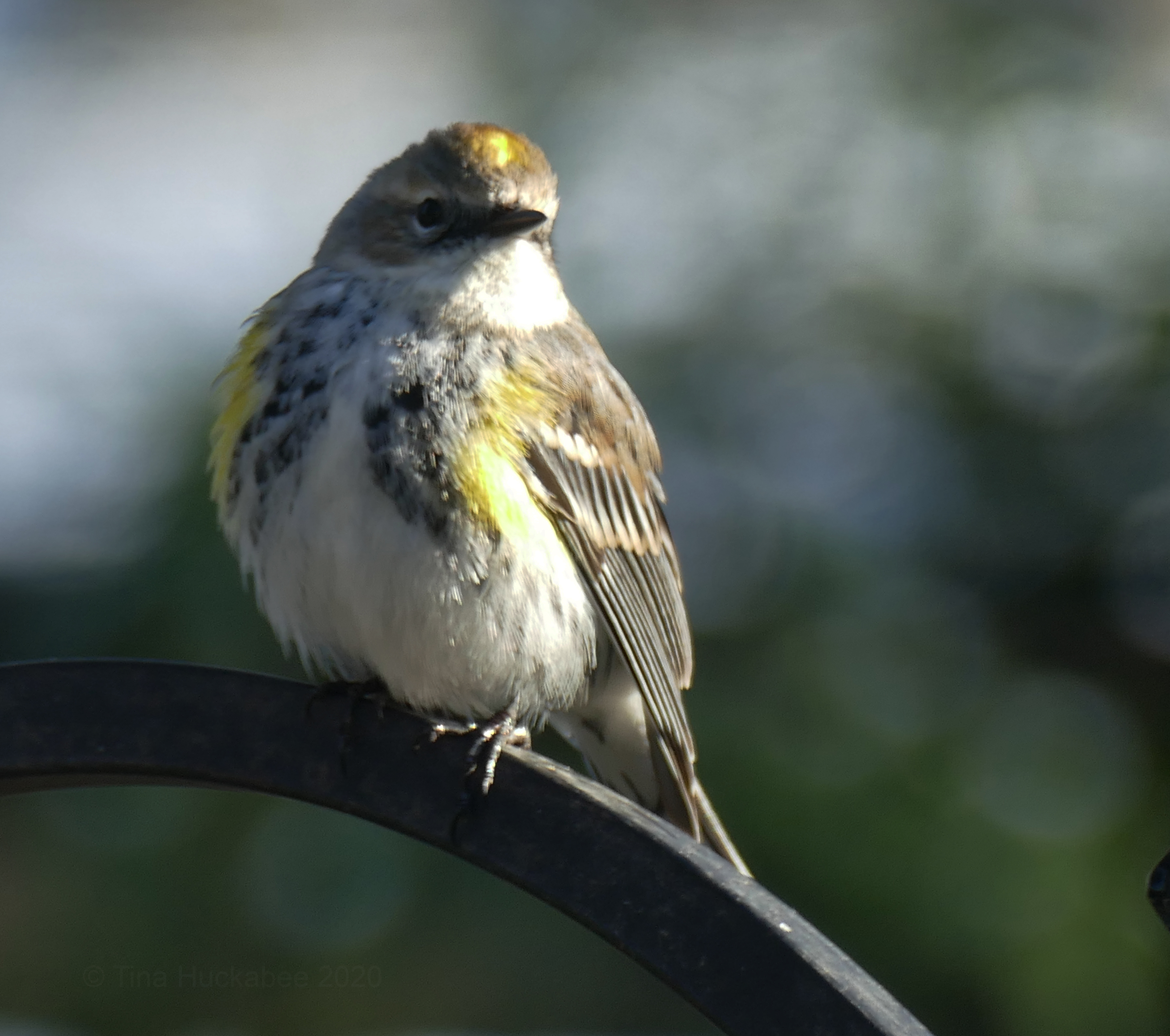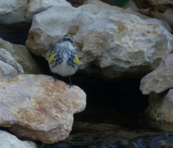 I’ve identified my Yellow-rump as female. She lacks the black mask across the eyes that a male Myrtle Yellow-rump warbler wears. Even without the mask and the bold coloring, she’s still very cute.