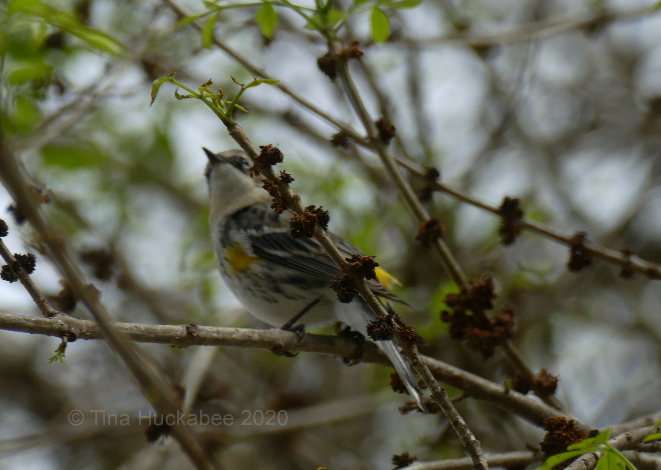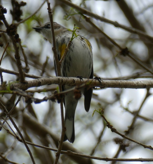 According to Cornell Lab of Ornithology, Yellow-rumps forage on the outside branches of trees and along those limbs in the bottom third of the tree. That’s exactly where I’ve noticed my warbler and thank goodness for that! She’d be even more difficult to observe if higher up in the trees.