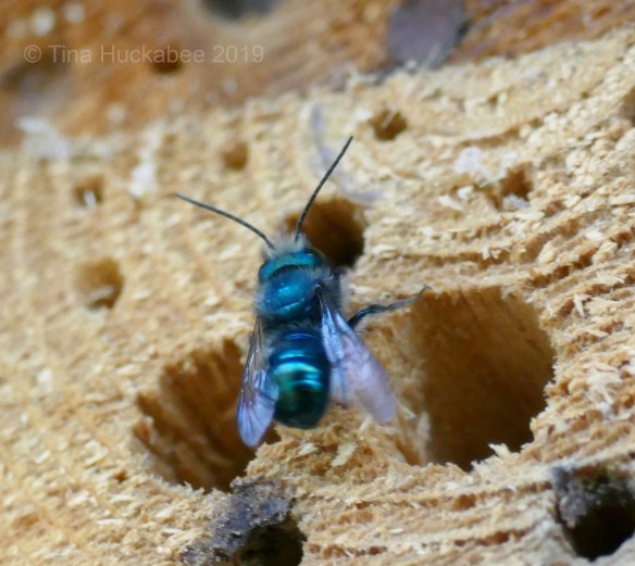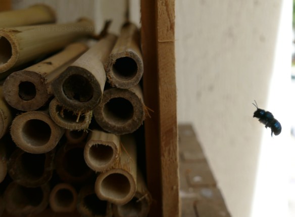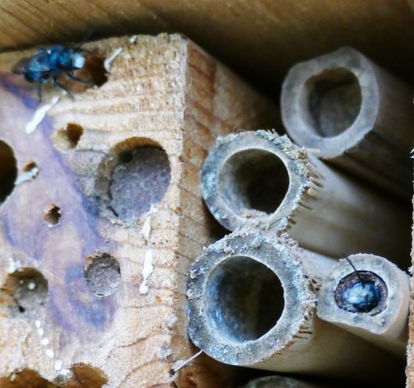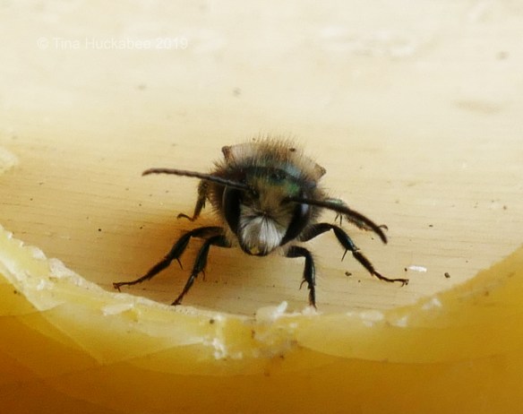 Unlike honeybees, who carry their pollen packs on their legs in what are formally known as corbiculae or pollen baskets; I call them pollen pantaloons, but that’s just me. Blue Orchard bees, members of the Mason bee family, carry gathered pollen on their tummies. This is the best shot I managed of a female heading into a nesting chamber with pollen. These gals are fast fliers! I’ve observed creamy white pollen-coated tummies, as well as cheery yellow and orange, color depending upon what bloom, or blooms, the female worked.