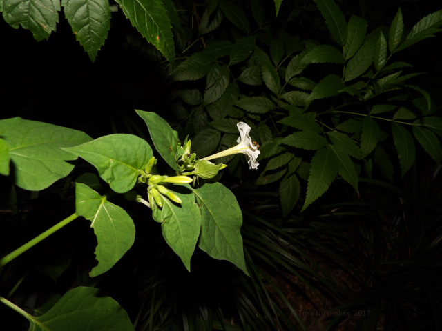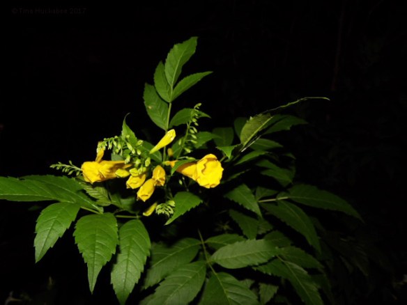 Not to be outdone in the dark, this preparing-to-blossom Yellow bells, Tacoma stans, begged for attention while overhanging a Four O-clock.